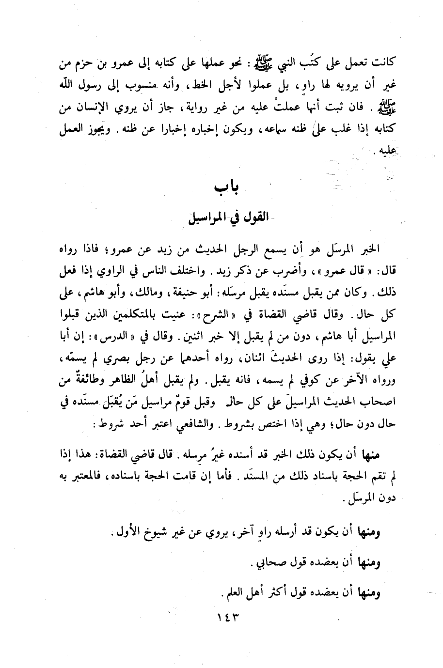 كَانَت تعْمل على كتب النَّبِي صلى الله عَلَيْهِ وَسلم نَحْو عَملهَا على كِتَابه إِلَى عَمْرو بن حزم من غير أَن يرويهِ لَهَا راو بل عمِلُوا لأجل الْخط وَأَنه مَنْسُوب إِلَى رَسُول الله صلى الله عَلَيْهِ وَسلم فان ثَبت أَنَّهَا عملت عَلَيْهِ من غير رِوَايَة جَازَ أَن يروي الْإِنْسَان من كِتَابه إِذا غلب على ظَنّه سَمَاعه وَيكون إخْبَاره إِخْبَارًا عَن ظَنّه وَيجوز الْعَمَل عَلَيْهِ - صَلَّى اللَّهُ عَلَيْهِ وَسَلَّم َ - بَاب القَوْل فِي الْمَرَاسِيل - صَلَّى اللَّهُ عَلَيْهِ وَسَلَّم َ -
