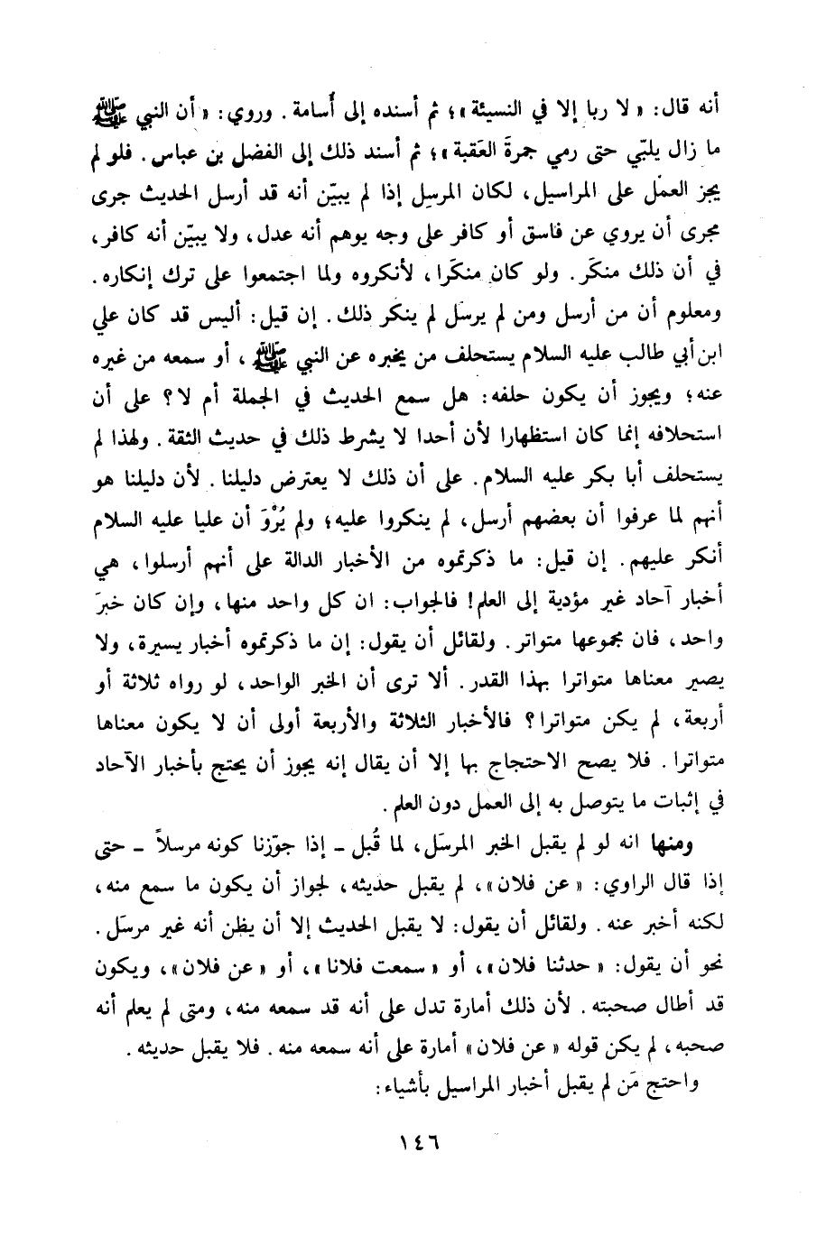 أَنه قَالَ لَا رَبًّا إِلَّا فِي النَّسِيئَة ثمَّ أسْندهُ إِلَى أُسَامَة وَرُوِيَ أَن النَّبِي صلى الله عَلَيْهِ وَسلم مَا زَالَ يُلَبِّي حَتَّى رمي جَمْرَة الْعقبَة ثمَّ اسند ذَلِك إِلَى الْفضل بن عَبَّاس فَلَو لم يجز الْعَمَل على الْمَرَاسِيل لَكَانَ الْمُرْسل إِذا لم يبين أَنه قد أرسل الحَدِيث جرى مجْرى أَن يروي عَن فَاسق أَو كَافِر على وَجه يُوهم أَنه عدل وَلَا يبين أَنه كَافِر فِي أَن ذَلِك مُنكر وَلَو كَانَ مُنْكرا لأنكروه وَلما اجْتَمعُوا على ترك إِنْكَاره وَمَعْلُوم أَن من أرسل وَمن لم يُرْسل لم يُنكر ذَلِك إِن قيل أَلَيْسَ قد كَانَ عَليّ ابْن أبي طَالب عَلَيْهِ السَّلَام يسْتَحْلف من يُخبرهُ عَن النَّبِي صلى الله عَلَيْهِ وَسلم أَو سَمعه من غَيره عَنهُ وَيجوز أَن يكون حلفه هَل سمع الحَدِيث فِي الْجُمْلَة أم لَا على أَن استحلافه إِنَّمَا كَانَ استظهارا لِأَن أحدا لَا يشرط ذَلِك فِي حَدِيث الثِّقَة وَلِهَذَا لم يسْتَحْلف أَبَا بكر عَلَيْهِ السَّلَام على أَن ذَلِك لَا يعْتَرض دليلنا لِأَن دليلنا هُوَ أَنهم لما عرفُوا أَن بَعضهم أرسل لم ينكروا عَلَيْهِ وَلم يرو أَن عليا عَلَيْهِ السَّلَام أنكر عَلَيْهِم إِن قيل مَا ذكرتموه من الْأَخْبَار الدَّالَّة على أَنهم أرْسلُوا هِيَ أَخْبَار آحَاد غير مؤدية إِلَى الْعلم فَالْجَوَاب ان كل وَاحِد مِنْهَا وَإِن كَانَ خبر وَاحِد فان مجموعها متواتر وَلقَائِل أَن يَقُول إِن مَا ذكرتموه أَخْبَار يسيرَة وَلَا يصير مَعْنَاهَا متواتر بِهَذَا الْقدر أَلا ترى أَن الْخَبَر الْوَاحِد لَو رَوَاهُ ثَلَاثَة أَو أَرْبَعَة لم يكن متواترا فالأخبار الثَّلَاثَة وَالْأَرْبَعَة أولى أَن لَا يكون مَعْنَاهَا متواترا فَلَا يَصح الِاحْتِجَاج بهَا إِلَّا ان يُقَال إِنَّه يجوز أَن يحْتَج بأخبار الْآحَاد فِي إِثْبَات مَا يتَوَصَّل بِهِ إِلَى الْعَمَل دون الْعلم