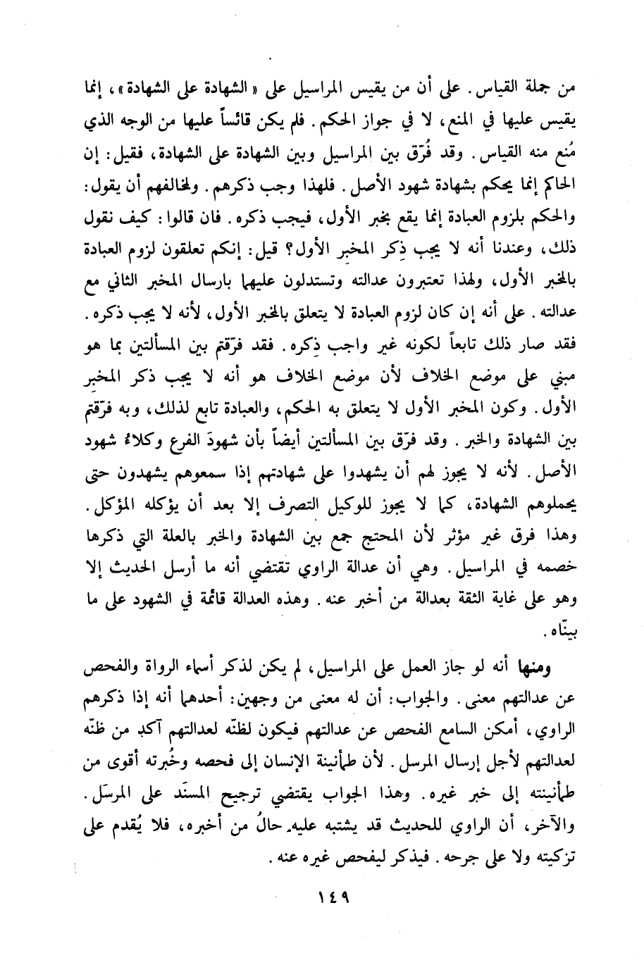 من جملَة الْقيَاس على أَن من يقيس الْمَرَاسِيل على الشَّهَادَة على الشَّهَادَة إِنَّمَا يقيس عَلَيْهَا فِي الْمَنْع لَا فِي جَوَاز الحكم فَلم يكن قائسا عَلَيْهَا من الْوَجْه الَّذِي منع مِنْهُ الْقيَاس وَقد فرق بَين الْمَرَاسِيل وَبَين الشَّهَادَة على الشَّهَادَة فَقيل إِن الْحَاكِم إِنَّمَا يحكم بِشَهَادَة شُهُود الأَصْل فَلهَذَا وَجب ذكرهم ولمخالفهم أَن يَقُول وَالْحكم بِلُزُوم الْعِبَادَة إِنَّمَا يَقع بِخَبَر الأول فَيجب ذكره فان قَالُوا كَيفَ نقُول ذَلِك وَعِنْدنَا أَنه لَا يجب ذكر الْمخبر الأول قيل إِنَّكُم تعلقون لُزُوم الْعِبَادَة بالمخبر الأول وَلِهَذَا تعتبرون عَدَالَته وتستدلون عَلَيْهِمَا بارسال الْمخبر الثَّانِي مَعَ عَدَالَته على أَنه إِن كَانَ لُزُوم الْعِبَادَة لَا يتَعَلَّق بالمخبر الأول لِأَنَّهُ لَا يجب ذكره فقد صَار ذَلِك تَابعا لكَونه غير وَاجِب ذكره فقد فرقتم بَين الْمَسْأَلَتَيْنِ بِمَا هُوَ مَبْنِيّ على مَوضِع الْخلاف لِأَن مَوضِع الْخلاف هُوَ أَنه لَا يجب ذكر الْمخبر الأول وَكَون الْمخبر الأول لَا يتَعَلَّق بِهِ الحكم وَالْعِبَادَة تَابع لذَلِك وَبِه فرقتم بَين الشَّهَادَة وَالْخَبَر وَقد فرق بَين الْمَسْأَلَتَيْنِ أَيْضا بِأَن شُهُود الْفَرْع وكلاء شُهُود الأَصْل لِأَنَّهُ لَا يجوز لَهُم أَن يشْهدُوا على شَهَادَتهم إِذا سمعوهم يشْهدُونَ حَتَّى يحملوهم الشَّهَادَة كَمَا لَا يجوز للْوَكِيل التَّصَرُّف إِلَّا بعد أَن يؤكله المؤكل وَهَذَا فرق غير مُؤثر لِأَن المحتج جمع بَين الشَّهَادَة وَالْخَبَر بِالْعِلَّةِ الَّتِي ذكرهَا خَصمه فِي الْمَرَاسِيل وَهِي أَن عَدَالَة الرَّاوِي تَقْتَضِي أَنه مَا أرسل الحَدِيث إِلَّا وَهُوَ على غَايَة الثِّقَة بعدالة من أخبر عَنهُ وَهَذِه الْعَدَالَة قَائِمَة فِي الشُّهُود على مَا بَيناهُ