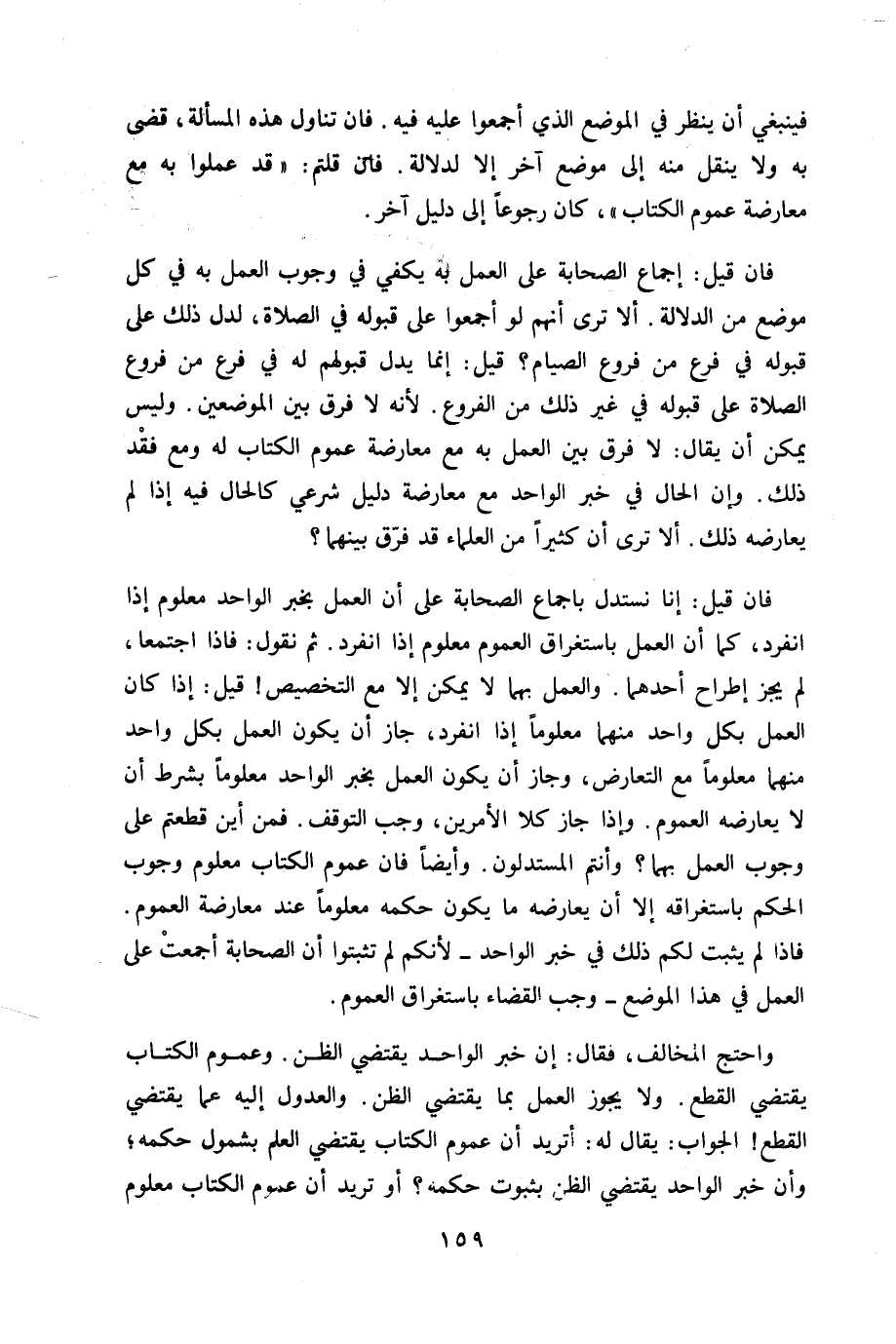 فان قيل إِنَّا نستدل باجماع الصَّحَابَة على ان الْعَمَل بِخَبَر الْوَاحِد مَعْلُوم إِذا انْفَرد كَمَا أَن الْعَمَل باستغراق الْعُمُوم مَعْلُوم إِذا انْفَرد ثمَّ نقُول فاذا اجْتمعَا لم يجز إطراح أَحدهمَا وَالْعَمَل بهما لَا يُمكن إِلَّا مَعَ التَّخْصِيص قيل إِذا كَانَ الْعَمَل بِكُل وَاحِد مِنْهُمَا مَعْلُوما إِذا انْفَرد جَازَ أَن يكون الْعَمَل بِكُل وَاحِد مِنْهُمَا مَعْلُوما مَعَ التَّعَارُض وَجَاز أَن يكون الْعَمَل بِخَبَر الْوَاحِد مَعْلُوما بِشَرْط أَن لَا يُعَارضهُ الْعُمُوم وَإِذا جَازَ كلا الْأَمريْنِ وَجب التَّوَقُّف فَمن أَيْن قطعْتُمْ على وجوب الْعَمَل بهما وَأَنْتُم المستدلون وَأَيْضًا فان عُمُوم الْكتاب مَعْلُوم وجوب الحكم باستغراقه إِلَّا أَن يُعَارضهُ مَا يكون حكمه مَعْلُوما عِنْد مُعَارضَة الْعُمُوم فاذا لم يثبت لكم ذَلِك فِي خبر الْوَاحِد لأنكم لم تثبتوا أَن الصَّحَابَة أَجمعت على الْعَمَل فِي هَذَا الْموضع وَجب الْقَضَاء باستغراق الْعُمُوم