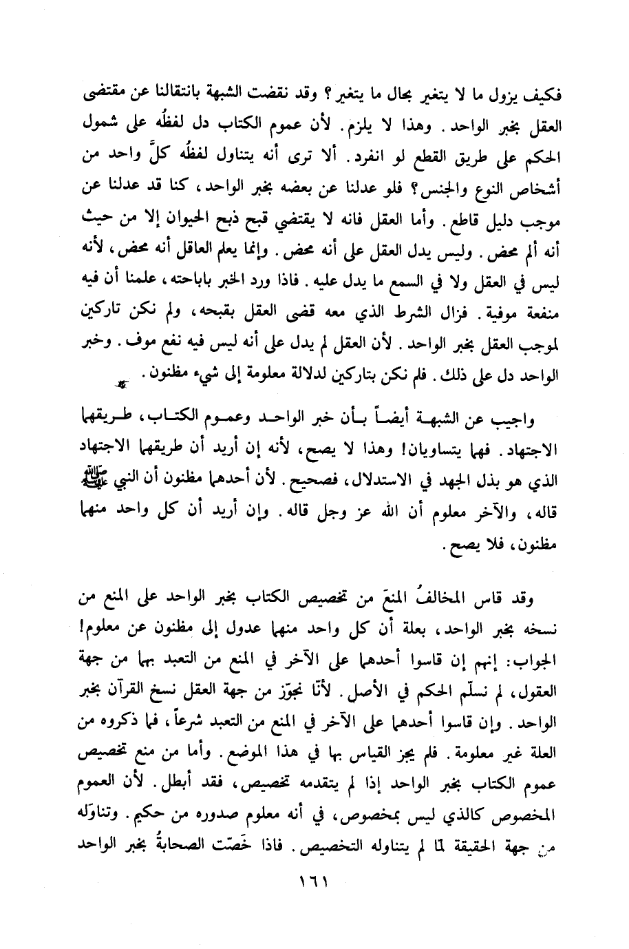 فَكيف يَزُول مَا لَا يتَغَيَّر بِحَال مَا يتَغَيَّر وَقد نقضت الشُّبْهَة بانتقالنا عَن مُقْتَضى الْعقل بِخَبَر الْوَاحِد وَهَذَا لَا يلْزم لِأَن عُمُوم الْكتاب دلّ لَفظه على شُمُول الحكم على طَرِيق الْقطع لَو انْفَرد أَلا ترى أَنه يتَنَاوَل لَفظه كل وَاحِد من أشخاص النَّوْع وَالْجِنْس فَلَو عدلنا عَن بعضه بِخَبَر الْوَاحِد كُنَّا قد عدلنا عَن مُوجب دَلِيل قَاطع وَأما الْعقل فانه لَا يَقْتَضِي قبح ذبح الْحَيَوَان إِلَّا من حَيْثُ أَنه ألم مَحْض وَلَيْسَ يدل الْعقل على انه مَحْض وَإِنَّمَا يعلم الْعَاقِل أَنه مَحْض لِأَنَّهُ لَيْسَ فِي الْعقل وَلَا فِي السّمع مَا يدل عَلَيْهِ فاذا ورد الْخَبَر باباحته علمنَا أَن فِيهِ مَنْفَعَة موفية فَزَالَ الشَّرْط الَّذِي مَعَه قضى الْعقل بقبحه وَلم نَكُنْ تاركين لموجب الْعقل بِخَبَر الْوَاحِد لِأَن الْعقل لم يدل على أَنه لَيْسَ فِيهِ نفع موف وَخبر الْوَاحِد دلّ على ذَلِك فَلم نَكُنْ بتاركين لدلَالَة مَعْلُومَة إِلَى شَيْء مظنون