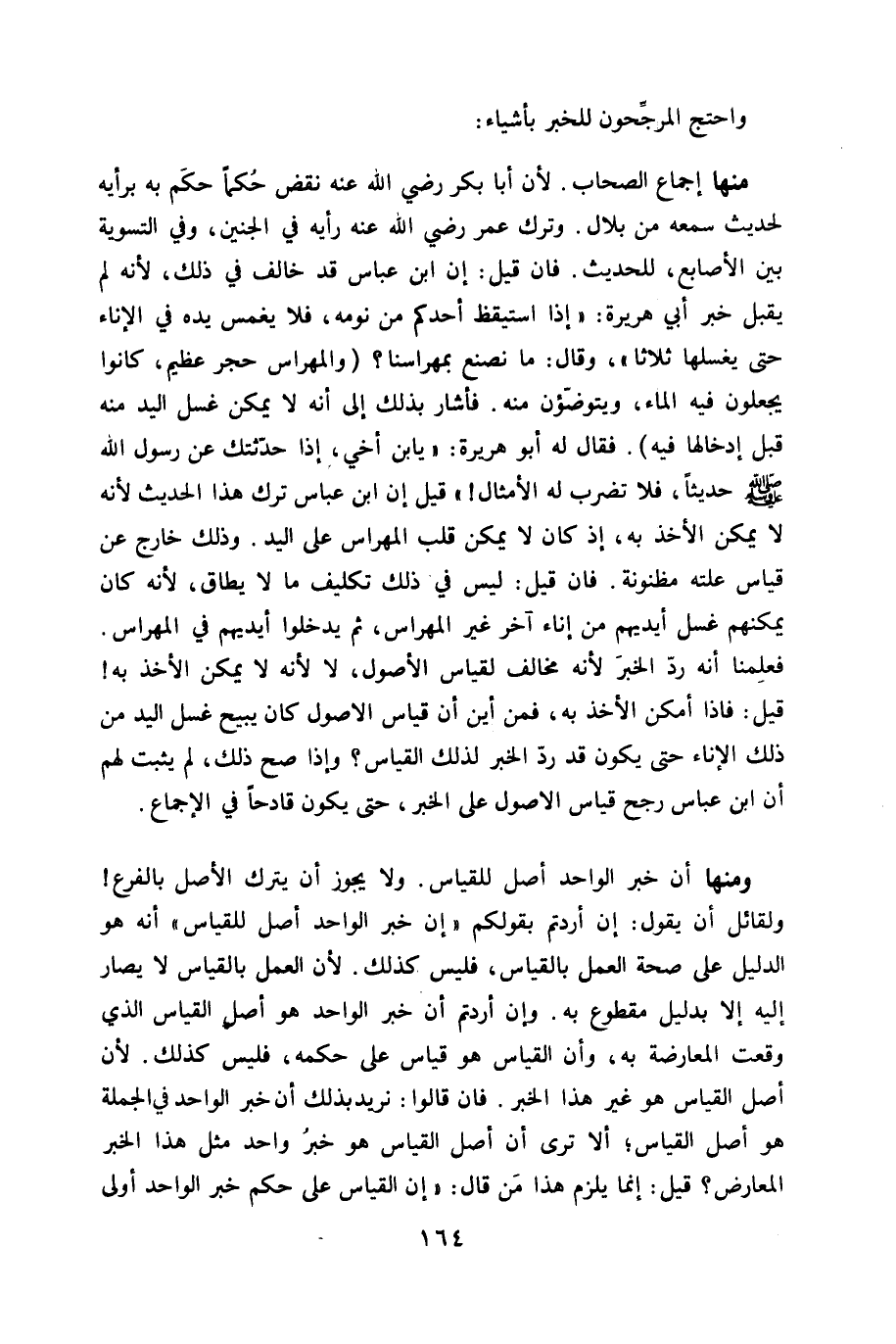 مِنْهَا إِجْمَاع الصحاب لِأَن أَبَا بكر رَضِي الله عَنهُ نقض حكما حكم بِهِ بِرَأْيهِ لحَدِيث سَمعه من بِلَال وَترك عمر رَضِي الله عَنهُ رَأْيه فِي الْجَنِين وَفِي التَّسْوِيَة بَين الْأَصَابِع للْحَدِيث فان قيل إِن ابْن عَبَّاس قد خَالف فِي ذَلِك لِأَنَّهُ لم يقبل خبر أبي هُرَيْرَة إِذا اسْتَيْقَظَ أحدكُم من نَومه فَلَا يغمس يَده فِي الْإِنَاء حَتَّى يغسلهَا ثَلَاثًا وَقَالَ مَا نصْنَع بمهراسنا والمهراس حجر عَظِيم كَانُوا يجْعَلُونَ فِيهِ المَاء ويتوضؤن مِنْهُ فَأَشَارَ بذلك إِلَى أَنه لَا يُمكن غسل الْيَد مِنْهُ قبل إدخالها فِيهِ فَقَالَ لَهُ أَبُو هُرَيْرَة يَا بن أخي إِذا حدثتك عَن رَسُول الله صلى الله عَلَيْهِ وَسلم حَدِيثا فَلَا تضرب لَهُ الْأَمْثَال قيل إِن ابْن عَبَّاس ترك هَذَا الحَدِيث لِأَنَّهُ لَا يُمكن الْأَخْذ بِهِ إِذْ كَانَ لَا يُمكن قلب المهراس على الْيَد وَذَلِكَ خَارج عَن قِيَاس علته مظنونة فان قيل لَيْسَ فِي ذك تَكْلِيف مَا لَا يُطَاق لِأَنَّهُ كَانَ يُمكنهُم غسل أَيْديهم من إِنَاء آخر غير المهراس ثمَّ يدخلُوا أَيْديهم فِي المهراس فَعلمنَا أَنه رد الْخَبَر لِأَنَّهُ مُخَالف لقياس الْأُصُول لَا لِأَنَّهُ لَا يُمكن الْأَخْذ بِهِ قيل فاذا أمكن الْأَخْذ بِهِ فَمن أَيْن أَن قِيَاس الاصول كَانَ يُبِيح غسل الْيَد من ذَلِك الْإِنَاء حَتَّى يكون قد رد الْخَبَر لذَلِك الْقيَاس وَإِذا صَحَّ ذَلِك لم يثبت لَهُم أَن ابْن عَبَّاس رجح قِيَاس الاصول على الْخَبَر حَتَّى يكون قادحا فِي الْإِجْمَاع