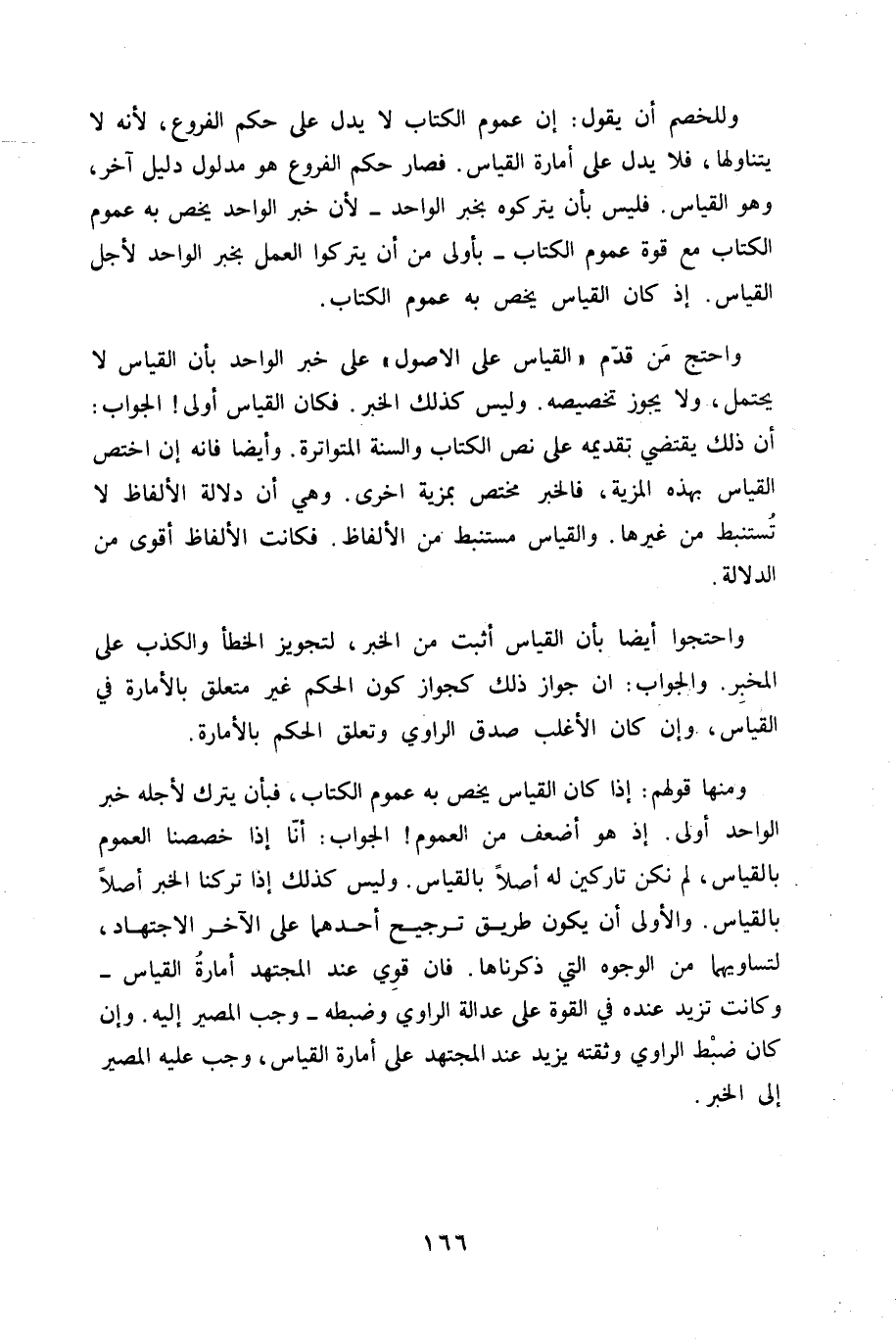وللخصم أَن يَقُول إِن عُمُوم الْكتاب لَا يدل على حكم الْفُرُوع لِأَنَّهُ لَا يَتَنَاوَلهَا فَلَا يدل على امارة الْقيَاس فَصَارَ حكم الْفُرُوع هُوَ مَدْلُول دَلِيل آخر وَهُوَ الْقيَاس فَلَيْسَ بِأَن يَتْرُكُوهُ بِخَبَر الْوَاحِد لِأَن خبر الْوَاحِد يخص بِهِ عُمُوم الْكتاب مَعَ قُوَّة عُمُوم الْكتاب بِأولى من أَن يتْركُوا الْعَمَل بِخَبَر الْوَاحِد لأجل الْقيَاس إِذْ كَانَ الْقيَاس يخص بِهِ عُمُوم الْكتاب