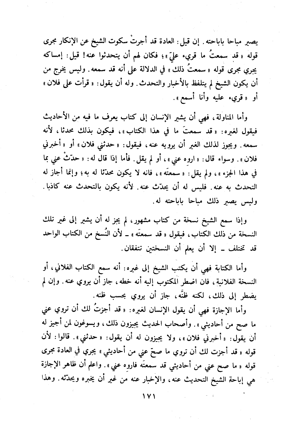 وَأما الْإِجَازَة فَهِيَ أَن يَقُول الْإِنْسَان لغيره قد أجزت لَك أَن تروي عني مَا صَحَّ من أحاديثي وَأَصْحَاب الحَدِيث يجيزون ذَلِك ويسوغون لمن اجيز لَهُ أَن يَقُول أَخْبرنِي فلَان وَلَا يجيزون لَهُ أَن يَقُول حَدثنِي قَالُوا لِأَن قَوْله قد أجزت لَك أَن تروي مَا صَحَّ عني من أحاديثي يجْرِي فِي الْعَادة مجْرى قَوْله مَا صَحَّ عني من أحاديثي قد سمعته فاروه عني وَاعْلَم أَن ظَاهر الْإِجَازَة هِيَ إِبَاحَة الشَّيْخ التحديث عَنهُ والإخبار عَنهُ من غير أَن يُخبرهُ ويحدثه وَهَذَا