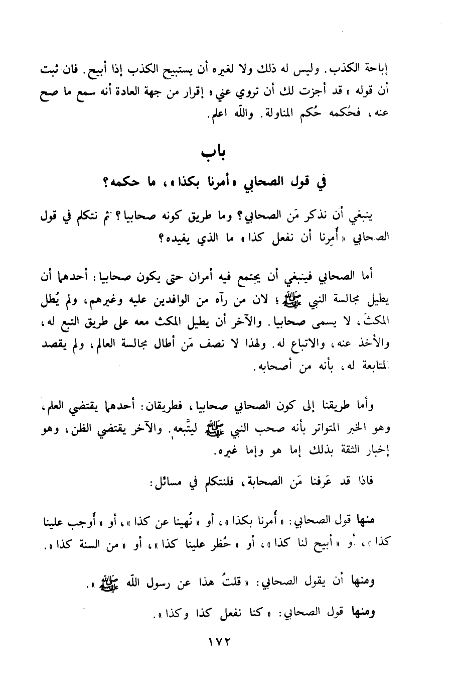إِبَاحَة الْكَذِب وَلَيْسَ لَهُ ذَلِك وَلَا لغيره أَن يستبيح الْكَذِب إِذا أُبِيح فان ثَبت أَن قَوْله قد أجزت لَك أَن تروي عني إِقْرَار من جِهَة الْعَادة أَنه سمع مَا صَحَّ عَنهُ فَحكمه حكم المناولة وَالله أعلم - صَلَّى اللَّهُ عَلَيْهِ وَسَلَّم َ - بَاب فِي قَول الصَّحَابِيّ أمرنَا بِكَذَا مَا حكمه - صَلَّى اللَّهُ عَلَيْهِ وَسَلَّم َ -