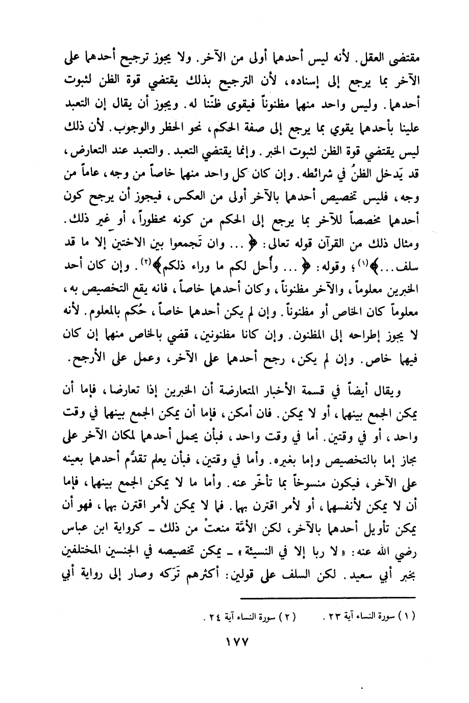 وَيُقَال أَيْضا فِي قسْمَة الْأَخْبَار المتعارضة أَن الْخَبَرَيْنِ إِذا تَعَارضا فإمَّا أَن يُمكن الْجمع بَينهمَا اَوْ لَا يُمكن فان أمكن فإمَّا ان يُمكن الْجمع بَينهمَا فِي وَقت وَاحِد أَو فِي وَقْتَيْنِ أما فِي وَقت وَاحِد فبأن يحمل أَحدهمَا لمَكَان الآخر على مجَاز إِمَّا بالتخصيص وَإِمَّا بِغَيْرِهِ وَأما فِي وَقْتَيْنِ فبأن يعلم تقدم أَحدهمَا بِعَيْنِه على الآخر فَيكون مَنْسُوخا بِمَا تاخر عَنهُ وَأما مَا لَا يُمكن الْجمع بَينهمَا فإمَّا أَن لَا يُمكن لأنفسهما أَو لأمر اقتران بهما فَمَا لَا يُمكن لأمر اقْترن بهما فَهُوَ أَن يُمكن تاويل أَحدهمَا بِالْآخرِ لَكِن الْأمة منعت من ذَلِك كَرِوَايَة ابْن عَبَّاس رَضِي الله عَنهُ لَا رَبًّا إِلَّا فِي النَّسِيئَة يُمكن تَخْصِيصه فِي الجنسين الْمُخْتَلِفين بِخَبَر أبي سعيد لَكِن السّلف على قَوْلَيْنِ أَكْثَرهم تَركه وَصَارَ إِلَى رِوَايَة أبي