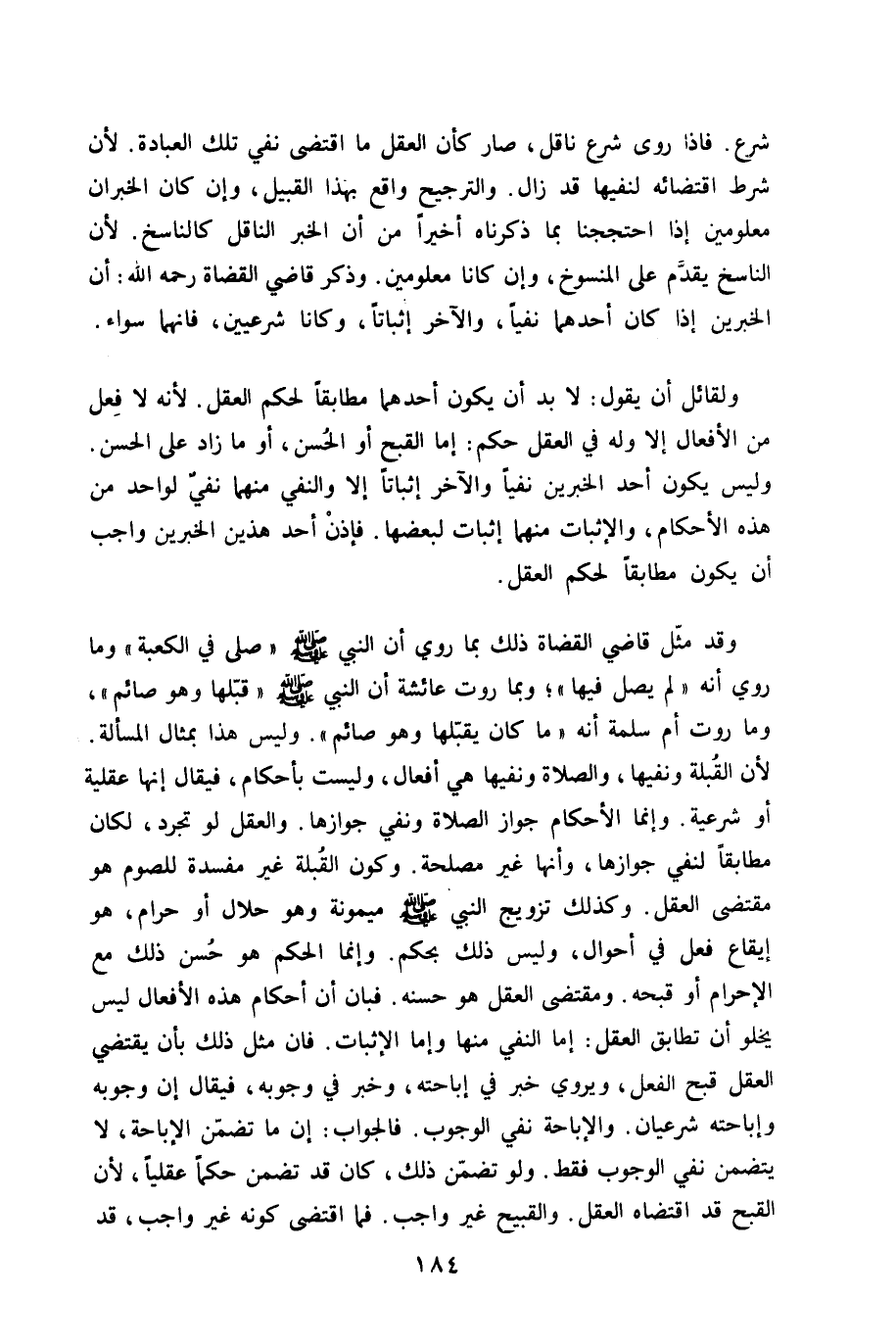 وَقد مثل قَاضِي الْقُضَاة ذَلِك بِمَا رُوِيَ أَن النَّبِي صلى الله عَلَيْهِ وَسلم صلى فِي الْكَعْبَة وَمَا رُوِيَ أَنه لم يصل فِيهَا وَبِمَا رَوَت عَائِشَة أَن النَّبِي صلى الله عَلَيْهِ وَسلم قبلهَا وَهُوَ صَائِم وَمَا رَوَت أم سَلمَة أَنه مَا كَانَ يقبلهَا وَهُوَ صَائِم وَلَيْسَ هَذَا بمثال الْمَسْأَلَة لِأَن الْقبْلَة ونفيها وَالصَّلَاة ونفيها هِيَ أَفعَال وَلَيْسَت بِأَحْكَام فَيُقَال إِنَّهَا عقلية اَوْ شَرْعِيَّة وَإِنَّمَا الْأَحْكَام جَوَاز الصَّلَاة وَنفي جَوَازهَا وَالْعقل لَو تجرد لَكَانَ مطابقا لنفي جَوَازهَا وَأَنَّهَا غير مصلحَة وَكَون الْقبْلَة غير مفْسدَة للصَّوْم هُوَ مُقْتَضى الْعقل وَكَذَلِكَ تَزْوِيج النَّبِي صلى الله عَلَيْهِ وَسلم مَيْمُونَة وَهُوَ حَلَال أَو حرَام هُوَ إِيقَاع فعل فِي أَحْوَال وَلَيْسَ ذَلِك بِحكم وَإِنَّمَا الحكم هُوَ حسن ذَلِك مَعَ الْإِحْرَام أَو قبحه وَمُقْتَضى الْعقل هُوَ حسنه فَبَان أَن أَحْكَام هَذِه الْأَفْعَال لَيْسَ يَخْلُو أَن تطابق الْعقل إِمَّا النَّفْي مِنْهَا وَإِمَّا الْإِثْبَات فان مثل ذَلِك بِأَن يَقْتَضِي الْعقل قبح الْفِعْل ويروي خبر فِي إِبَاحَته وَخبر فِي وُجُوبه فَيُقَال إِن وُجُوبه وإباحته شرعيان وَالْإِبَاحَة نفي الْوُجُوب فَالْجَوَاب إِن مَا تضمن الْإِبَاحَة لَا يتَضَمَّن نفي الْوُجُوب فَقَط وَلَو تضمن ذَلِك كَانَ قد تضمن حكما عقليا لِأَن الْقبْح قد اقْتَضَاهُ الْعقل والقبيح غير وَاجِب فَمَا اقْتضى كَونه غير وَاجِب قد