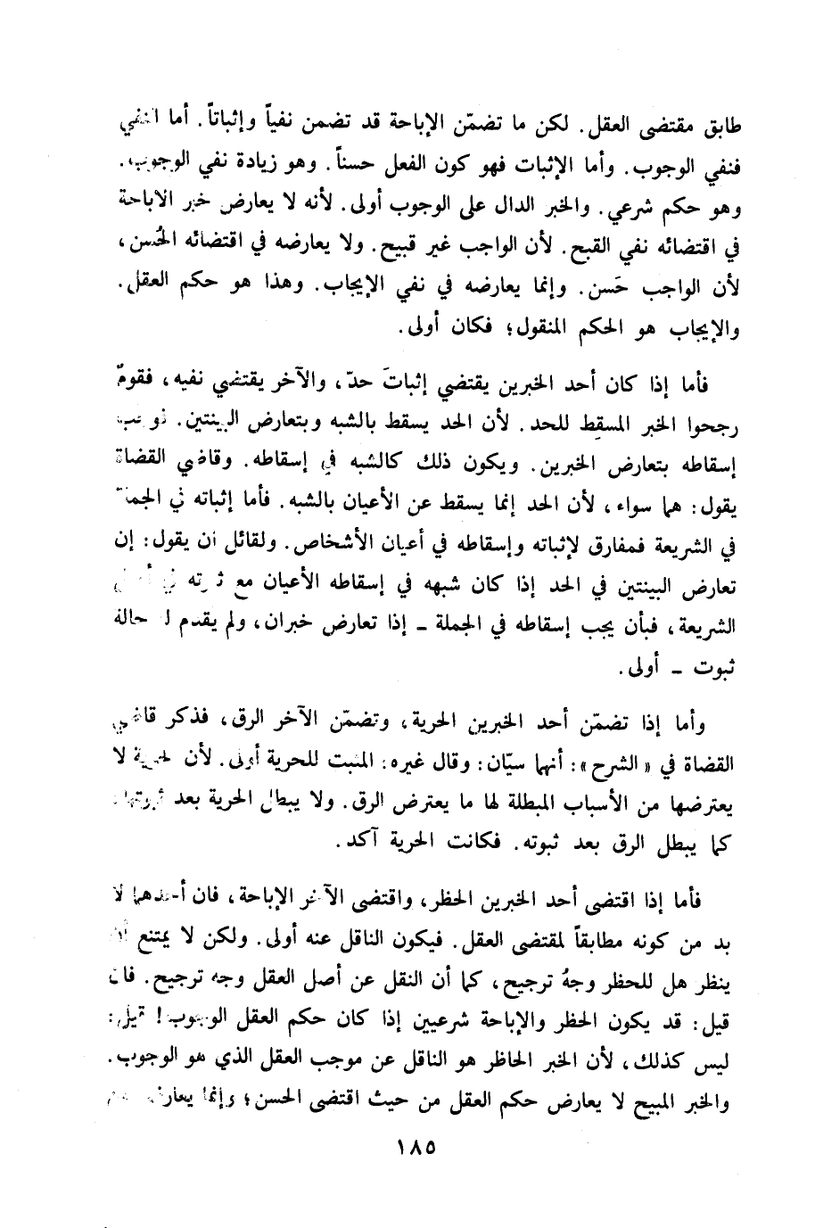 فَأَما إِذا اقْتضى أحد الْخَبَرَيْنِ الْحَظْر وَاقْتضى الآخر الْإِبَاحَة فان أَحدهمَا لَا بُد من كَونه مطابقا لمقْتَضى الْعقل فَيكون النَّاقِل عَنهُ أولى وَلَكِن لَا يمْتَنع أَن ينظر هَل للحظر وَجه تَرْجِيح كَمَا أَن النَّقْل عَن أصل الْعقل وَجه تَرْجِيح فان قيل قد يكون الْحَظْر وَالْإِبَاحَة شرعيين إِذا كَانَ حكم الْعقل الْوُجُوب قيل لَيْسَ كَذَلِك لِأَن الْخَبَر الحاظر هُوَ النَّاقِل عَن مُوجب الْعقل الَّذِي هُوَ الْوُجُوب وَالْخَبَر الْمُبِيح لَا يُعَارض حكم الْعقل من حَيْثُ اقْتضى الْحسن وَإِنَّمَا يُعَارضهُ من