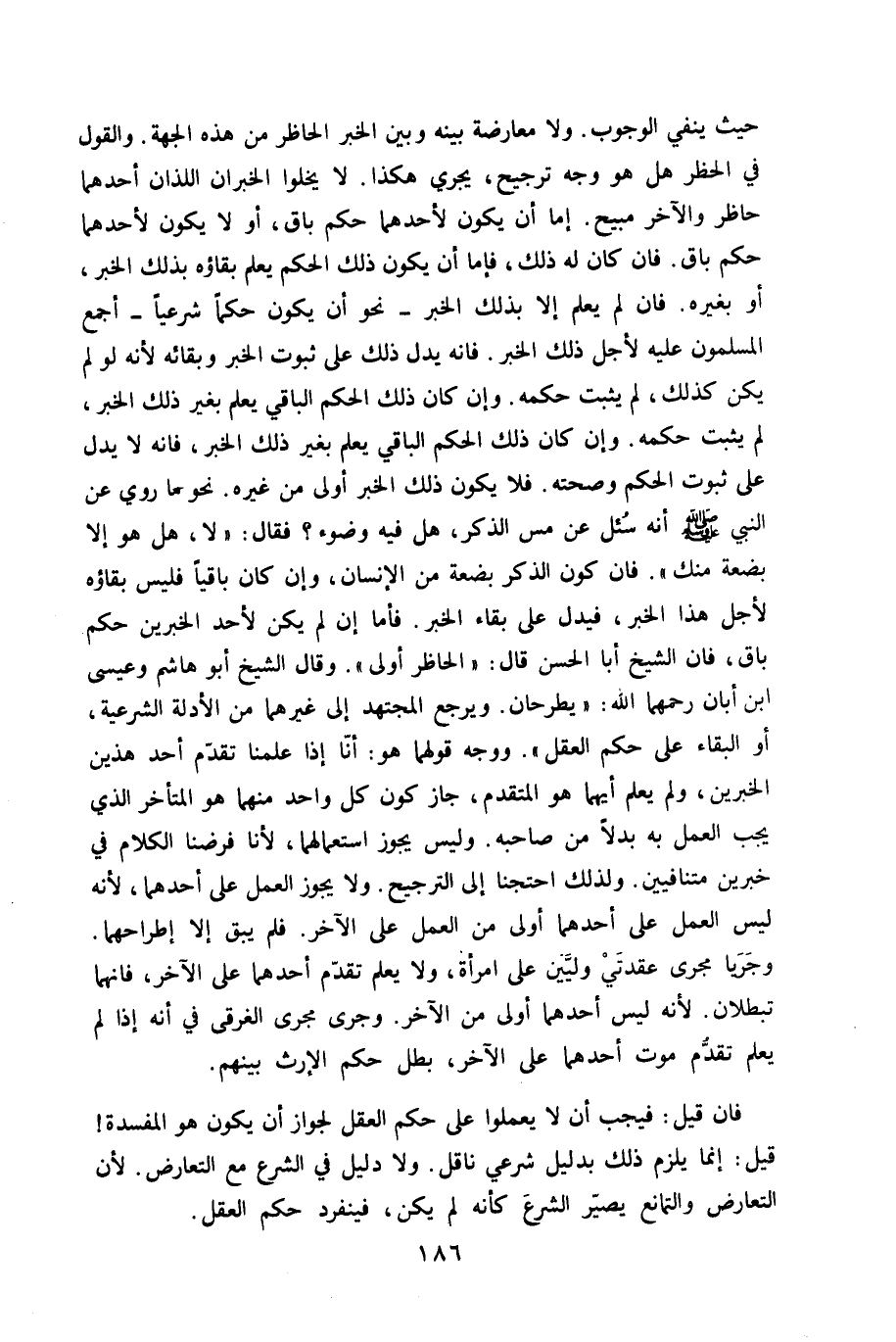 حَيْثُ يَنْفِي الْوُجُوب وَلَا مُعَارضَة بَينه وَبَين الْخَبَر الحاظر من هَذِه الْجِهَة وَالْقَوْل فِي الْحَظْر هَل هُوَ وَجه تَرْجِيح يجْرِي هَكَذَا لَا يخلوا الخبران اللَّذَان أَحدهمَا حاظر وَالْآخر مُبِيح إِمَّا أَن يكون لأَحَدهمَا حكم بَاقٍ أَو لَا يكون لأَحَدهمَا حكم بَاقٍ فان كَانَ لَهُ ذَلِك فإمَّا أَن يكون ذَلِك الحكم يعلم بَقَاؤُهُ بذلك الْخَبَر أَو بِغَيْرِهِ فان لم يعلم إِلَّا بذلك الْخَبَر نَحْو أَن يكون حكما شَرْعِيًّا أجمع الْمُسلمُونَ عَلَيْهِ لأجل ذَلِك الْخَبَر فانه يدل ذَلِك على ثُبُوت الْخَبَر وبقائه لِأَنَّهُ لَو لم يكن كَذَلِك لم يثبت حكمه وَإِن كَانَ ذَلِك الحكم الْبَاقِي يعلم بِغَيْر ذَلِك الْخَبَر لم يثبت حكمه وَإِن كَانَ ذَلِك الحكم الْبَاقِي يعلم بِغَيْر ذَلِك الْخَبَر فانه لَا يدل على ثُبُوت الحكم وَصِحَّته فَلَا يكون ذَلِك الْخَبَر أولى من غَيره نَحْو مَا رُوِيَ عَن النَّبِي صلى الله عَلَيْهِ وَسلم أَنه سُئِلَ عَن مس الذّكر هَل فِيهِ وضوء فَقَالَ لَا هَل هُوَ إِلَّا بضعَة مِنْك فان كَون الذّكر بضعَة من الْإِنْسَان وَإِن كَانَ بَاقِيا فَلَيْسَ بَقَاؤُهُ لأجل هَذَا الْخَبَر فَيدل على بَقَاء الْخَبَر فَأَما إِن لم يكن لأحد الْخَبَرَيْنِ حكم بَاقٍ فان الشَّيْخ ابا الْحسن قَالَ الحاظر أولى وَقَالَ الشَّيْخ ابو هَاشم وَعِيسَى ابْن أبان رحمهمَا الله يطرحان وَيرجع الْمُجْتَهد إِلَى غَيرهمَا من الْأَدِلَّة الشَّرْعِيَّة أَو الْبَقَاء على حكم الْعقل وَوجه قَوْلهمَا هُوَ أَنا إِذا علمنَا تقدم أحد هذَيْن الْخَبَرَيْنِ وَلم يعلم ايهما هُوَ الْمُتَقَدّم جَازَ كَون كل وَاحِد مِنْهُمَا هُوَ الْمُتَأَخر الَّذِي يجب الْعَمَل بِهِ بَدَلا من صَاحبه وَلَيْسَ يجوز استعمالهما لأَنا فَرضنَا الْكَلَام فِي خبرين متنافيين وَلذَلِك احتجنا إِلَى التَّرْجِيح وَلَا يجوز الْعَمَل على أَحدهمَا لِأَنَّهُ لَيْسَ الْعَمَل على أَحدهمَا أولى من الْعَمَل على الآخر فَلم يبْق إِلَّا إطراحهما وجريا مجْرى عقدتي وليين على امْرَأَة وَلَا يعلم تقدم أَحدهمَا على الآخر فانهما تبطلان لِأَنَّهُ لَيْسَ أَحدهمَا أولى من الآخر وَجرى مجْرى الغرقى فِي أَنه إِذا لم يعلم تقدم أَحدهمَا على الآخر بَطل حكم الْإِرْث بَينهم