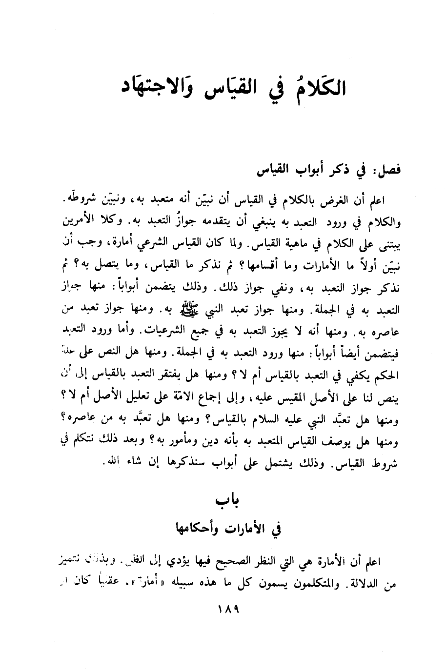 اعْلَم أَن الْغَرَض بالْكلَام فِي الْقيَاس أَن نبين أَنه متعبد بِهِ ونبين شُرُوطه وَالْكَلَام فِي وُرُود التَّعَبُّد بِهِ يَنْبَغِي أَن يتقدمه جَوَاز التَّعَبُّد بِهِ وكلا الْأَمريْنِ يبتنى على الْكَلَام فِي مَاهِيَّة الْقيَاس وَلما كَانَ الْقيَاس الشَّرْعِيّ أَمارَة وَجب أَن نبين أول مَا الأمارات وَمَا أقسامها ثمَّ نذْكر مَا الْقيَاس وَمَا يتَّصل بِهِ ثمَّ نذْكر جَوَاز التَّعَبُّد بِهِ وَنفي جَوَاز ذَلِك وَذَلِكَ يتَضَمَّن أبوابا مِنْهَا جَوَاز التَّعَبُّد بِهِ فِي الْجُمْلَة وَمِنْهَا جَوَاز تعبد النَّبِي صلى الله عَلَيْهِ وَسلم بِهِ وَمِنْهَا جَوَاز تعبد من عاصره بِهِ وَمِنْهَا أَنه لَا يجوز التَّعَبُّد بِهِ فِي جَمِيع الشرعيات وَأما وُرُود التَّعَبُّد فيتضمن أَيْضا أبوابا مِنْهَا وُرُود التَّعَبُّد بِهِ فِي الْجُمْلَة وَمِنْهَا هَل النَّص على عِلّة الحكم يَكْفِي فِي التَّعَبُّد بِالْقِيَاسِ أم لَا وَمِنْهَا هَل يفقتر التَّعَبُّد بِالْقِيَاسِ إِلَى أَن ينص لنا على الأَصْل الْمَقِيس عَلَيْهِ وَإِلَى إِجْمَاع الامة على تَعْلِيل الأَصْل أم لَا وَمِنْهَا هَل تعبد النَّبِي عَلَيْهِ السَّلَام بِالْقِيَاسِ وَمِنْهَا هَل تعبد بِهِ من عاصره وَمِنْهَا هَل يُوصف الْقيَاس المتعبد بِهِ بِأَنَّهُ دين ومأمور بِهِ وَبعد ذَلِك نتكلم فِي شُرُوط الْقيَاس وَذَلِكَ يشْتَمل على أَبْوَاب سنذكرها إِن شَاءَ الله - صَلَّى اللَّهُ عَلَيْهِ وَسَلَّم َ - بَاب فِي الأمارات وأحكامها - صَلَّى اللَّهُ عَلَيْهِ وَسَلَّم َ -