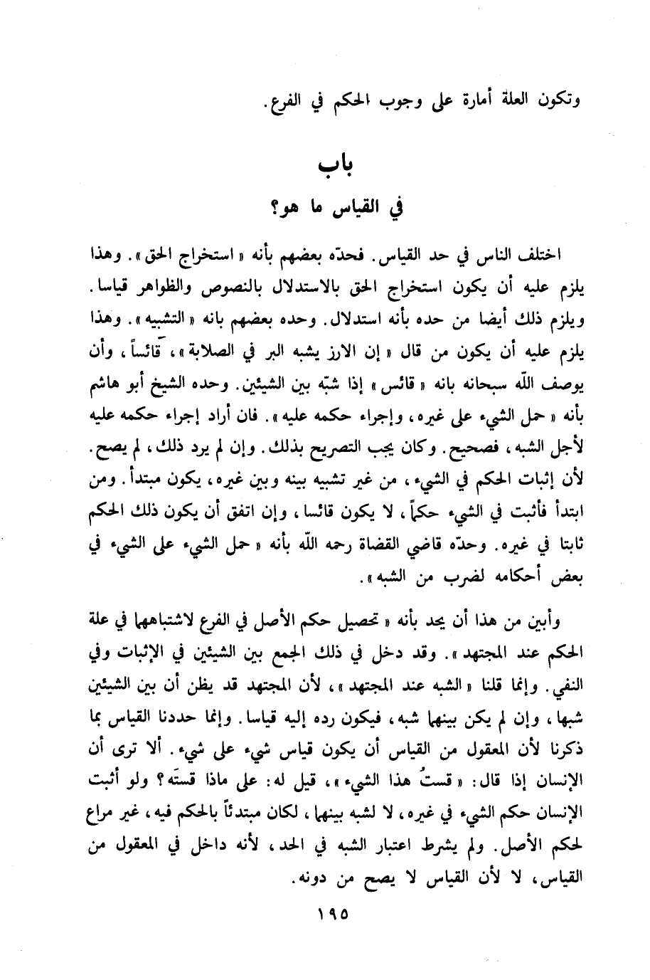 وَأبين من هَذَا أَن يحد بِأَنَّهُ تَحْصِيل حكم الأَصْل فِي الْفَرْع لاشتباههما فِي عِلّة الحكم عِنْد الْمُجْتَهد وَقد دخل فِي ذَلِك الْجمع بَين الشَّيْئَيْنِ فِي الْإِثْبَات وَفِي النَّفْي وَإِنَّمَا قُلْنَا الشّبَه عِنْد الْمُجْتَهد لِأَن الْمُجْتَهد قد يظنّ أَن بَين الشَّيْئَيْنِ شبها وَإِن لم يكن بَينهمَا شبه فَيكون رده إِلَيْهِ قِيَاسا وَإِنَّمَا حددنا الْقيَاس بِمَا ذكرنَا لِأَن الْمَعْقُول من الْقيَاس أَن يكون قِيَاس شَيْء على شَيْء أَلا ترى أَن الْإِنْسَان إِذا قَالَ قست هَذَا الشَّيْء قيل لَهُ على مَاذَا قسته وَلَو أثبت الْإِنْسَان حكم الشَّيْء فِي غَيره لَا لشبه بَينهمَا لَكَانَ مبتدئا بالحكم فِيهِ غير مراع لحكم الأَصْل وَلم يشرط اعْتِبَار الشّبَه فِي الْحَد لِأَنَّهُ دَاخل فِي الْمَعْقُول من الْقيَاس لَا لِأَن الْقيَاس لَا يَصح من دونه