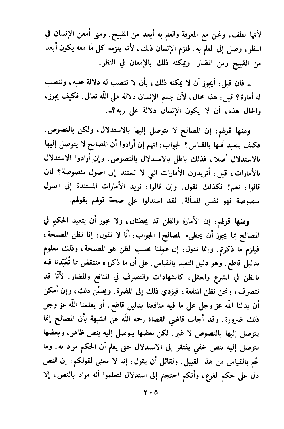 وَمِنْهَا قَوْلهم إِن الْمصَالح لَا يتَوَصَّل إِلَيْهَا بالاستدلال وَلَكِن بالنصوص فَكيف يتعبد فِيهَا بِالْقِيَاسِ الْجَواب أَنهم إِن أَرَادوا أَن الْمصَالح لَا يتَوَصَّل إِلَيْهَا بالاستدلال أصلا فَذَلِك بَاطِل بالاستدلال بالنصوص وَإِن أَرَادوا الِاسْتِدْلَال بالأمارات قيل أتريدون الأمارات الَّتِي لَا تستند إِلَى اصول منصوصة فان قَالُوا نعم فَكَذَلِك نقُول وَإِن قَالُوا نُرِيد الأمارات المستندة إِلَى اصول منصوصة فَهُوَ نفس الْمَسْأَلَة فقد استدلوا على صِحَة قَوْلهم بقَوْلهمْ
