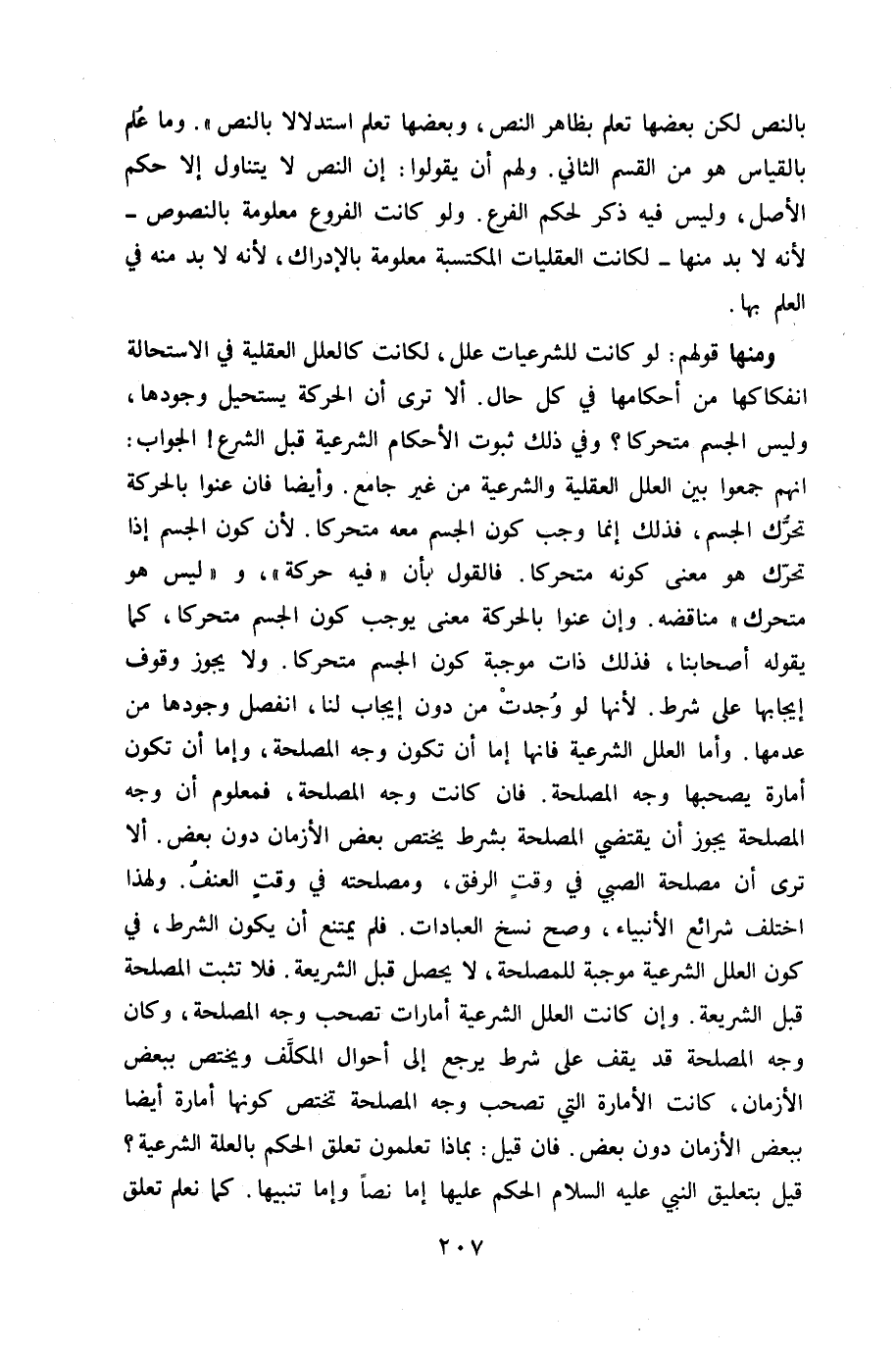 وَمِنْهَا قَوْلهم لَو كَانَت للشرعيات علل لكَانَتْ كالعلل الْعَقْلِيَّة فِي الاستحالة انفكاكها من أَحْكَامهَا فِي كل حَال أَلا ترى أَن الْحَرَكَة يَسْتَحِيل وجودهَا وَلَيْسَ الْجِسْم متحركا وَفِي ذَلِك ثُبُوت الْأَحْكَام الشَّرْعِيَّة قبل الشَّرْع الْجَواب أَنهم جمعُوا بَين الْعِلَل الْعَقْلِيَّة والشرعية من غير جَامع وَأَيْضًا فان عنوا بالحركة تحرّك الْجِسْم فَذَلِك إِنَّمَا وَجب كَون الْجِسْم مَعَه متحركا لِأَن كَون الْجِسْم إِذا تحرّك هُوَ معنى كَونه متحركا فَالْقَوْل بِأَن فِيهِ حَرَكَة وَلَيْسَ هُوَ متحرك مناقضة وَإِن عنوا بالحركة معنى يُوجب كَون الْجِسْم متحركا كَمَا يَقُوله أَصْحَابنَا فَذَلِك ذَات مُوجبَة كَون الْجِسْم متحركا وَلَا يجوز وقُوف ايجابها على شَرط لِأَنَّهَا لَو وجدت من دون إِيجَاب لنا انْفَصل وجودهَا من عدمهَا وَأما الْعِلَل الشَّرْعِيَّة فانها إِمَّا أَن تكون وَجه الْمصلحَة وَإِمَّا أَن تكون أَمارَة يصحبها وَجه الْمصلحَة فان كَانَت وَجه الْمصلحَة فمعلوم أَن وَجه الْمصلحَة يجوز أَن يَقْتَضِي الْمصلحَة بِشَرْط يخْتَص بعض الْأَزْمَان دون بعض أَلا ترى أَن مصلحَة الصَّبِي فِي وَقت الرِّفْق ومصلحته فِي وَقت العنف وَلِهَذَا اخْتلف شرائع الْأَنْبِيَاء وَصَحَّ نسخ الْعِبَادَات فَلم يمْتَنع أَن يكون الشَّرْط فِي كَون الْعِلَل الشَّرْعِيَّة مُوجبَة للْمصْلحَة لَا يحصل قبل الشَّرِيعَة فَلَا تثبت الْمصلحَة قبل الشَّرِيعَة وَإِن كَانَت الْعِلَل الشَّرْعِيَّة امارات تصْحَب وَجه الْمصلحَة وَكَانَ وَجه الْمصلحَة قد يقف على شَرط يرجع إِلَى أَحْوَال الْمُكَلف وَيخْتَص بِبَعْض الْأَزْمَان كَانَت الأمارة الَّتِي تصْحَب وَجه الْمصلحَة تخْتَص كَونهَا أَمارَة أَيْضا بِبَعْض الْأَزْمَان دون بعض فان قيل بِمَاذَا تعلمُونَ تعلق الحكم بِالْعِلَّةِ الشَّرْعِيَّة قيل بتعليق النَّبِي عَلَيْهِ السَّلَام الحكم عَلَيْهَا إِمَّا نصا وَإِمَّا تَنْبِيها كَمَا نعلم تعلق
