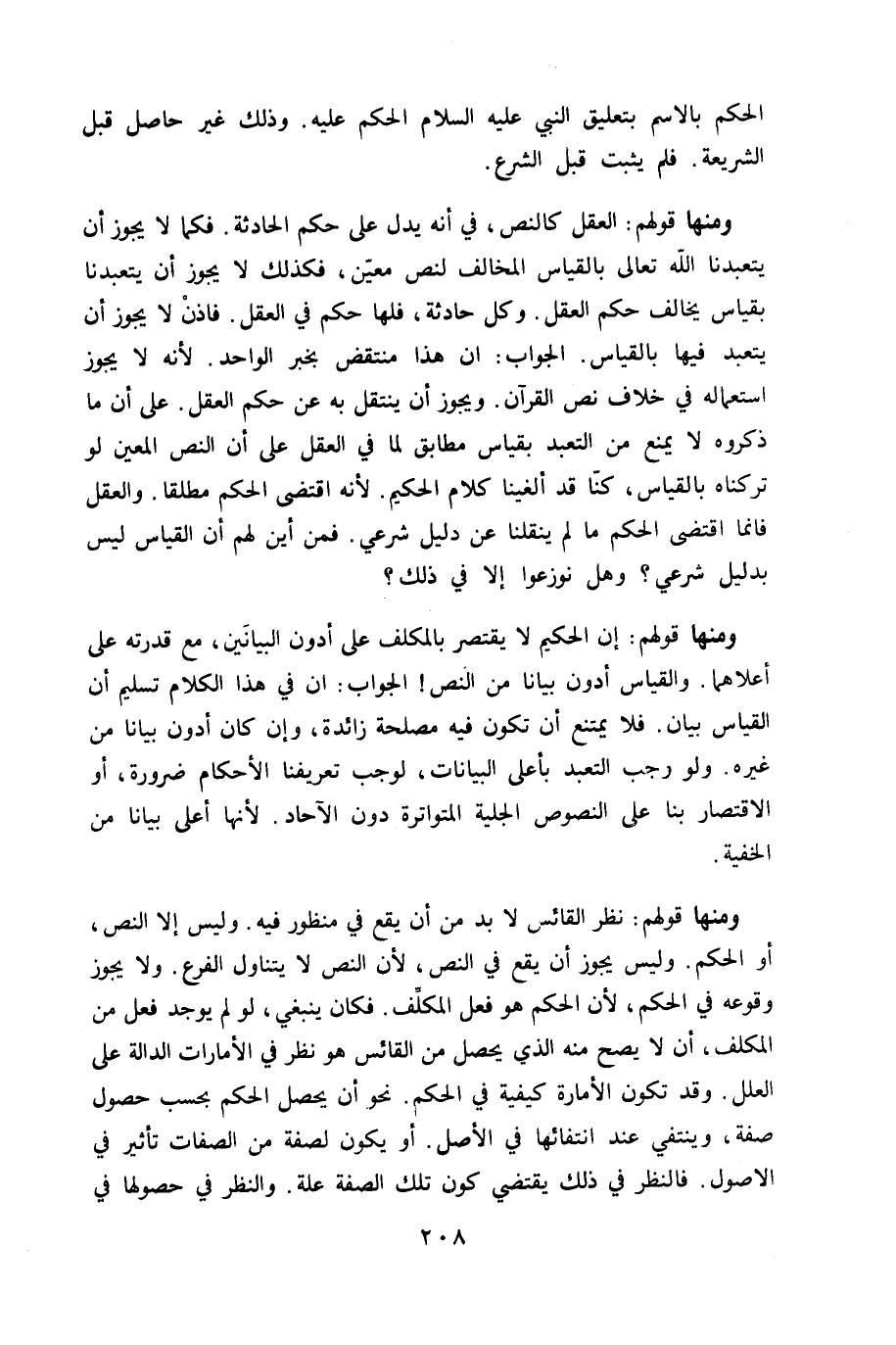 وَمِنْهَا قَوْلهم الْعقل كالنص فِي أَنه يدل على حكم الْحَادِثَة فَكَمَا لَا يجوز أَن يتعبدنا الله تَعَالَى بِالْقِيَاسِ الْمُخَالف لنَصّ معِين فَكَذَلِك لَا يجوز أَن يتعبدنا بِقِيَاس يُخَالف حكم الْعقل وكل حَادِثَة فلهَا حكم فِي الْعقل فاذن لَا يجوز أَن يتعبد فِيهَا بِالْقِيَاسِ الْجَواب أَن هَذَا منتقض بِخَبَر الْوَاحِد لِأَنَّهُ لَا يجوز اسْتِعْمَاله فِي خلاف نَص الْقُرْآن وَيجوز أَن ينْتَقل بِهِ عَن حكم الْعقل على أَن مَا ذَكرُوهُ لَا يمْنَع من التَّعَبُّد بِقِيَاس مُطَابق لما فِي الْعقل على أَن النَّص الْمعِين لَو تَرَكْنَاهُ بِالْقِيَاسِ كُنَّا قد ألغينا كَلَام الْحَكِيم لِأَنَّهُ اقْتضى الحكم مُطلقًا وَالْعقل فانما اقْتضى الحكم مَا لم ينقلنا عَن دَلِيل شَرْعِي فَمن أَيْن لَهُم أَن الْقيَاس لَيْسَ بِدَلِيل شَرْعِي وَهل نوزعوا إِلَّا فِي ذَلِك