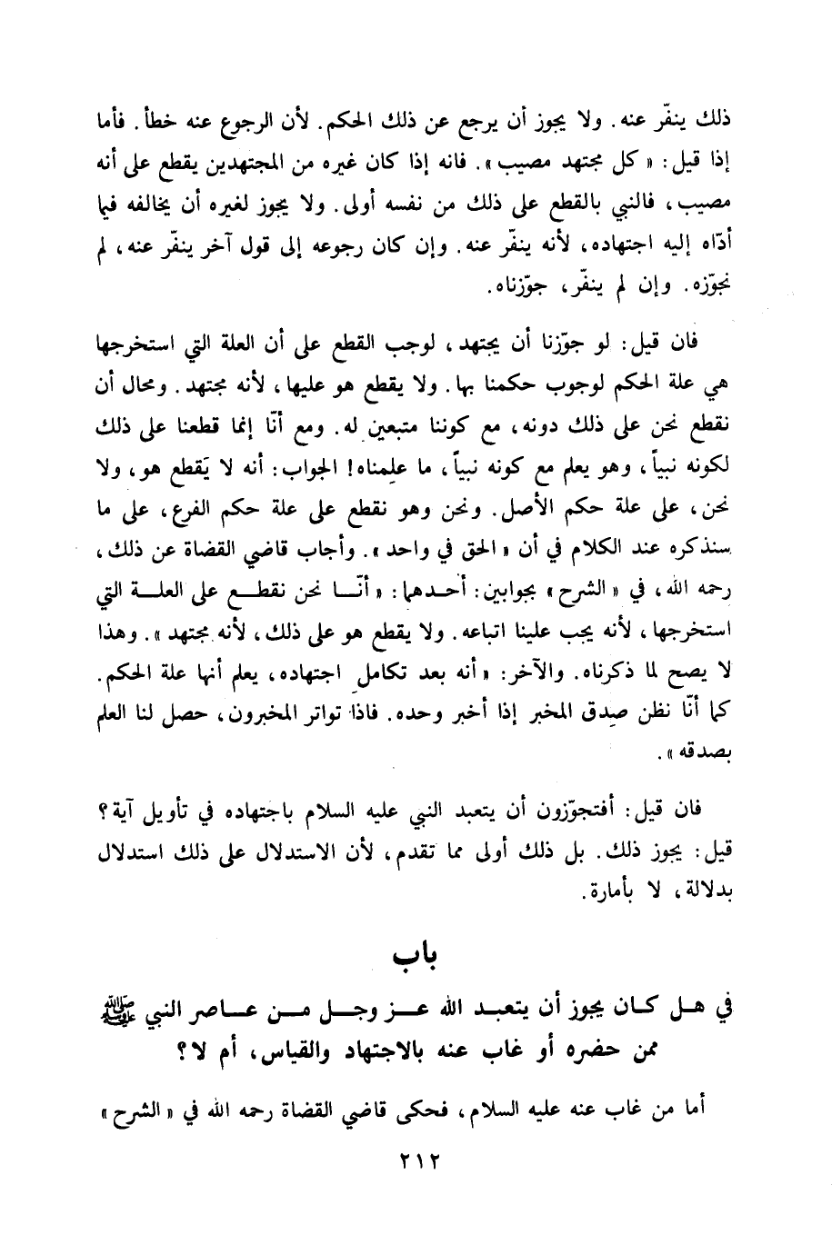 فان قيل أفتجوزون أَن يتعبد النَّبِي عَلَيْهِ السَّلَام بِاجْتِهَادِهِ فِي تَأْوِيل آيَة قيل يجوز ذَلِك بل ذَلِك أولى مِمَّا تقدم لِأَن الِاسْتِدْلَال على ذَلِك اسْتِدْلَال بِدلَالَة لَا بأمارة - صَلَّى اللَّهُ عَلَيْهِ وَسَلَّم َ - بَاب فِي هَل كَانَ يجوز ان يتعبد الله عز وَجل من عاصر النَّبِي صلى الله عَلَيْهِ وَسلم مِمَّن حَضَره أَو غَابَ عَنهُ بِالِاجْتِهَادِ وَالْقِيَاس أم لَا - صَلَّى اللَّهُ عَلَيْهِ وَسَلَّم َ -