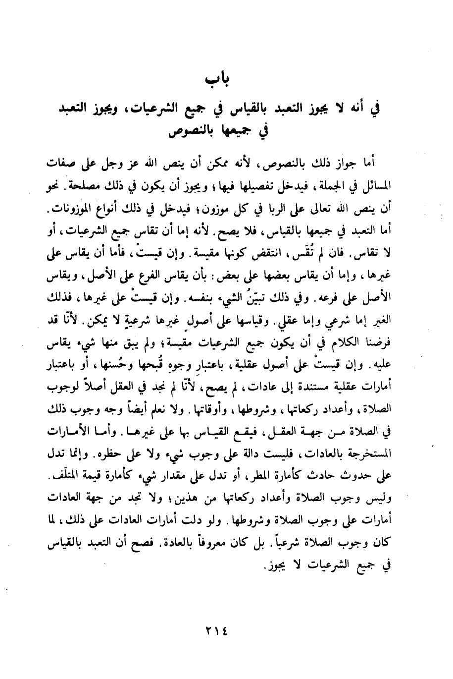 - صَلَّى اللَّهُ عَلَيْهِ وَسَلَّم َ - بَاب فِي أَنه لَا يجوز التَّعَبُّد بِالْقِيَاسِ فِي جَمِيع الشرعيات وَيجوز التَّعَبُّد فِي جَمِيعهَا بالنصوص - صَلَّى اللَّهُ عَلَيْهِ وَسَلَّم َ -