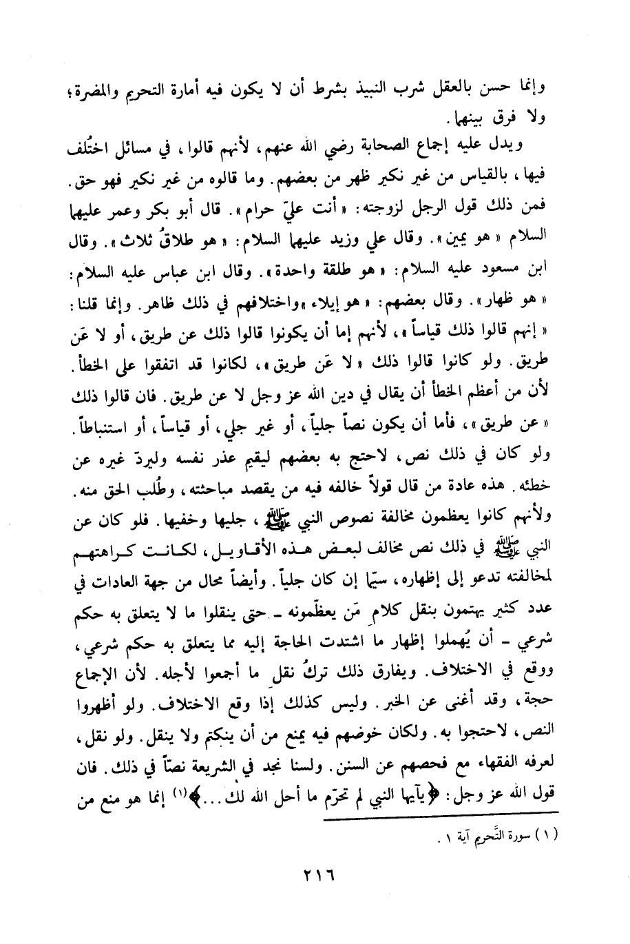 وَيدل عَلَيْهِ إِجْمَاع الصَّحَابَة رَضِي الله عَنهُ لأَنهم قَالُوا فِي مسَائِل اخْتلف فِيهَا بِالْقِيَاسِ من غير نَكِير ظهر من بَعضهم وَمَا قَالُوهُ من غير نَكِير فَهُوَ حق فَمن ذَلِك قَول الرجل لزوجته أَنْت عَليّ حرَام قَالَ أَبُو بكر وَعمر عَلَيْهِمَا السَّلَام هُوَ يَمِين وَقَالَ عَليّ وَزيد عَلَيْهِمَا السَّلَام هُوَ طَلَاق ثَالِث وَقَالَ ابْن مَسْعُود عَلَيْهِ السَّلَام هُوَ طَلْقَة وَاحِدَة وَقَالَ ابْن عَبَّاس عَلَيْهِ السَّلَام هُوَ ظِهَار وَقَالَ بَعضهم هُوَ إِيلَاء وَاخْتِلَافهمْ فِي ذَلِك ظَاهر وَإِنَّمَا قُلْنَا إِنَّهُم قَالُوا ذَلِك قِيَاسا لأَنهم إِمَّا أَن يَكُونُوا قَالُوا ذَلِك عَن طَرِيق أَو لَا عَن طَرِيق وَلَو كَانُوا قَالُوا ذَلِك لَا عَن طَرِيق لكانوا قد اتَّفقُوا على الْخَطَأ لِأَن من أعظم الْخَطَأ أَن يُقَال فِي دين الله عز وَجل لَا عَن طَرِيق فان قَالُوا ذَلِك عَن طَرِيق فَأَما أَن يكون نصا جليا أَو غير جلي أَو قِيَاسا أَو استنابطا وَلَو كَانَ فِي ذَلِك نَص لاحتج بِهِ بَعضهم ليقيم عذر نَفسه وليرد غَيره عَن خطئه هَذِه عَادَة من قَالَ قولا خَالفه فِيهِ من يقْصد مباحثته وَطلب الْحق مِنْهُ وَلِأَنَّهُم كَانُوا يعظمون مُخَالفَة نُصُوص النَّبِي صلى الله عَلَيْهِ وَسلم جليها وخفيها فَلَو كَانَ عَن النَّبِي صلى الله عَلَيْهِ وَسلم فِي ذَلِك نَص مُخَالف لبَعض هَذِه الْأَقَاوِيل لكَانَتْ كراهتهم لمُخَالفَته تَدْعُو إِلَى إِظْهَاره سِيمَا إِن كَانَ جليا وَأَيْضًا محَال من جِهَة الْعَادَات فِي عدد كثير يهتمون بِنَقْل كَلَام من يعظمونه حَتَّى ينقلوا مَا لَا يتَعَلَّق بِهِ حكم شَرْعِي أَن يهملوا إِظْهَار مَا اشتدت الْحَاجة إِلَيْهِ مِمَّا يتَعَلَّق بِهِ حكم شَرْعِي وَوَقع فِي الِاخْتِلَاف وَيُفَارق ذَلِك ترك نقل مَا أَجمعُوا لأَجله لِأَن الْإِجْمَاع حجَّة وَقد أغْنى عَن الْخَبَر وَلَيْسَ كَذَلِك إِذا وَقع الِاخْتِلَاف وَلَو أظهرُوا النَّص لاحتجوا بِهِ ولكان خوضهم فِيهِ يمْنَع من أَن ينكتم وَلَا ينْقل وَلَو نقل لعرفه الْفُقَهَاء مَعَ فحصهم عَن السّنَن ولسنا نجد فِي الشَّرِيعَة نصا فِي ذَلِك فان قَول الله عز وَجل {يَا أَيهَا النَّبِي لم تحرم مَا أحل الله لَك} إِنَّمَا هُوَ منع من