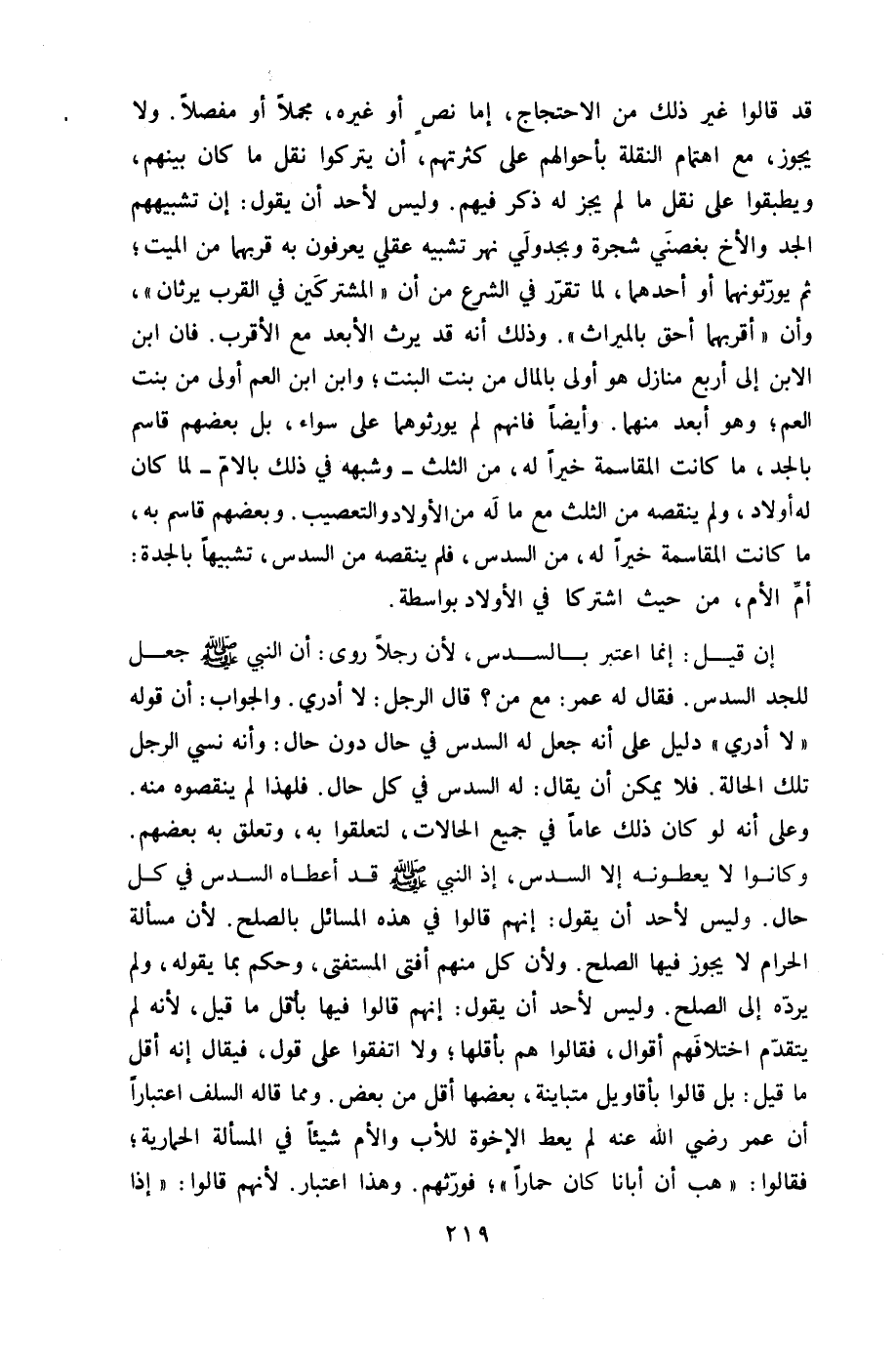 قد قَالُوا غير ذَلِك من الِاحْتِجَاج إِمَّا نَص أَو غَيره مُجملا أَو مفصلا وَلَا يجوز مَعَ اهتمام النقلَة بأحوالهم على كثرتهم أَن يتْركُوا نقل مَا كَانَ بَينهم ويطبقوا على نقل مَا لم يجز لَهُ ذكر فيهم وَلَيْسَ لأحد أَن يَقُول إِن تشبيههم الْجد وَالْأَخ بغصني شَجَرَة وبجدولي نهر تَشْبِيه عَقْلِي يعْرفُونَ بِهِ قربهما من الْمَيِّت ثمَّ يورثونهما أَو أَحدهمَا لما تقرر فِي الشَّرْع من أَن المشتركين فِي الْقرب يرثان وَأَن أقربهما أَحَق بِالْمِيرَاثِ وَذَلِكَ أَنه قد يَرث الْأَبْعَد مَعَ الْأَقْرَب فان ابْن الابْن إِلَى أَربع منَازِل هُوَ أولى بِالْمَالِ من بنت الْبِنْت وَابْن ابْن الْعم أول من بنت الْعم وَهُوَ أبعد مِنْهُمَا وَأَيْضًا فانهم لم يورثوهما على سَوَاء بل بَعضهم قَاسم بالجد مَا كَانَت الْمُقَاسَمَة خيرا لَهُ من الثُّلُث وَشبهه فِي ذَلِك بَالَام لما كَانَ لَهُ أَوْلَاد وَلم ينقصهُ من الثُّلُث مَعَ مَا لَهُ من الْأَوْلَاد والتعصيب وَبَعْضهمْ قَاسم بِهِ مَا كَانَت الْمُقَاسَمَة خيرا لَهُ من السُّدس فَلم ينقصهُ من السُّدس تَشْبِيها بالجدة أم الْأُم من حَيْثُ اشْتَركَا فِي الْأَوْلَاد بِوَاسِطَة