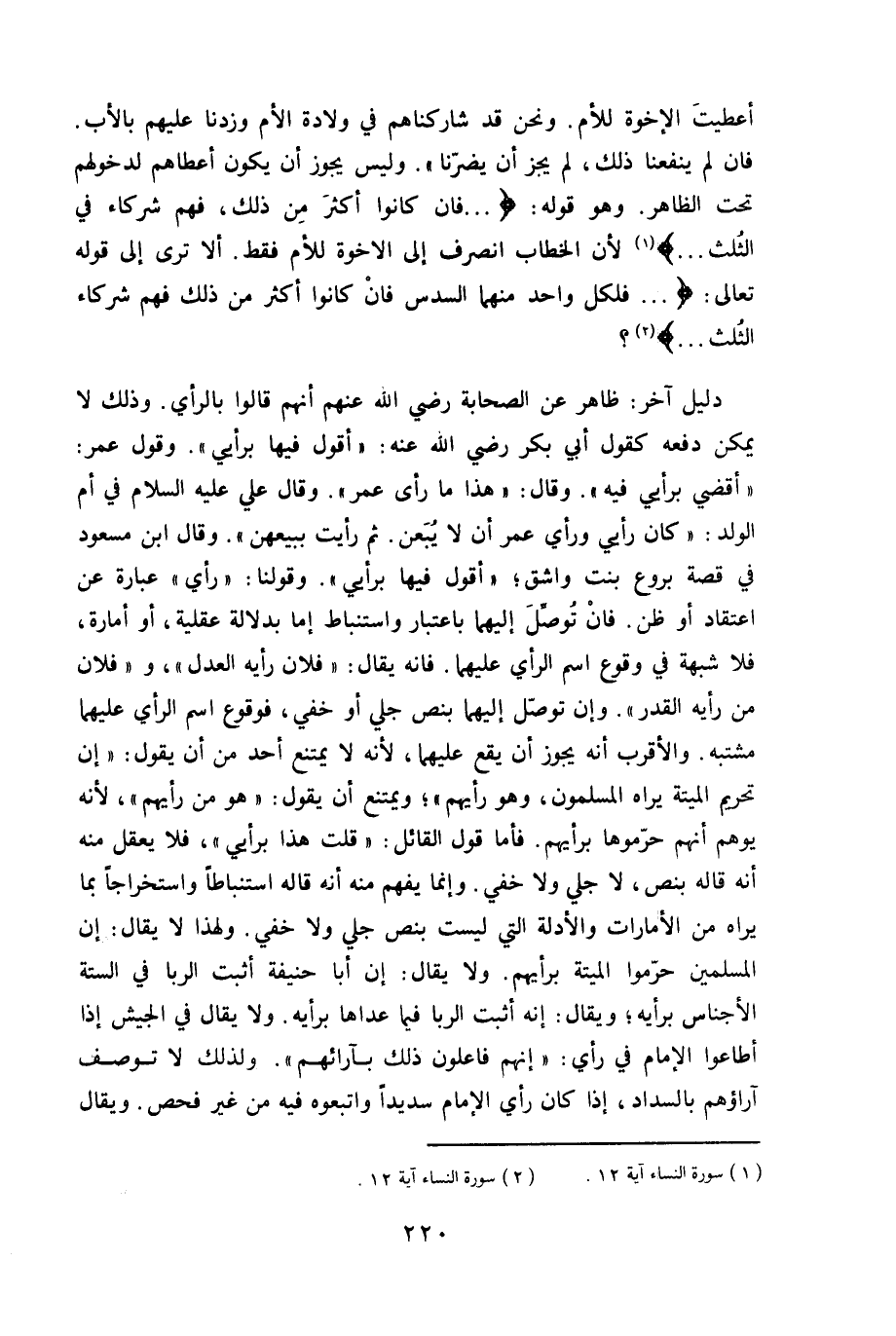 دَلِيل آخر ظَاهر عَن الصَّحَابَة رَضِي الله عَنْهُم أَنهم قَالُوا بِالرَّأْيِ وَذَلِكَ لَا يُمكن دَفعه كَقَوْل أبي بكر رَضِي الله عَنهُ أَقُول فِيهَا برأيي وَقَول عمر اقضي برأيي فِيهِ وَقَالَ هَذَا مَا رأى عمر وَقَالَ عَليّ عَلَيْهِ السَّلَام فِي أم الْوَلَد كَانَ رَأْيِي ورأي عمر أَن لَا يبعن ثمَّ رَأَيْت ببيعهن وَقَالَ ابْن مَسْعُود فِي قصَّة بروع بنت واشق أَقُول فِيهَا برأيي وَقَوْلنَا رَأْي عبارَة عَن اعْتِقَاد أَو ظن فان توصل إِلَيْهِمَا بِاعْتِبَار واستنباط إِمَّا بِدلَالَة عقلية أَو امارة فَلَا شُبْهَة فِي وُقُوع اسْم الرَّأْي عَلَيْهِمَا فانه يُقَال فلَان رَأْيه الْعدْل وَفُلَان من رَأْيه الْقدر وَإِن توصل إِلَيْهِمَا بِنَصّ جلي أَو خَفِي فوقوع اسْم الرَّأْي عَلَيْهِمَا مشتبه وَالْأَقْرَب أَنه يجوز أَن يَقع عَلَيْهِمَا لِأَنَّهُ لَا يمْتَنع أحد من أَن يَقُول إِن تَحْرِيم الْميتَة يرَاهُ الْمُسلمُونَ وَهُوَ رَأْيهمْ وَيمْتَنع أَن يَقُول هُوَ من رَأْيهمْ لِأَنَّهُ يُوهم أَنهم حرموها برأيهم فَأَما قَول الْقَائِل قلت هَذَا برأيي فَلَا يعقل مِنْهُ أَنه قَالَه بِنَصّ لَا جلي وَلَا خَفِي وَإِنَّمَا يفهم مِنْهُ أَنه قَالَه استنباطا واستخراجا بِمَا يرَاهُ من الأمارات والأدلة الَّتِي لَيست بِنَصّ جلي وَلَا خَفِي وَلِهَذَا لَا يُقَال إِن الْمُسلمين حرمُوا الْميتَة برأيهم وَلَا يُقَال إِن ابا حنيفَة اثْبتْ الرِّبَا فِي السِّتَّة الْأَجْنَاس بِرَأْيهِ وَيُقَال إِنَّه أثبت الرِّبَا فِيمَا عَداهَا بِرَأْيهِ وَلَا يُقَال فِي الْجَيْش إِذا اطاعوا الإِمَام فِي رَأْي إِنَّهُم فاعلون ذَلِك بأرائهم وَلذَلِك لَا تُوصَف آراؤهم بالسداد إِذا كَانَ رَأْي الإِمَام سديدا واتبعوه فِيهِ من غير فحص وَيُقَال