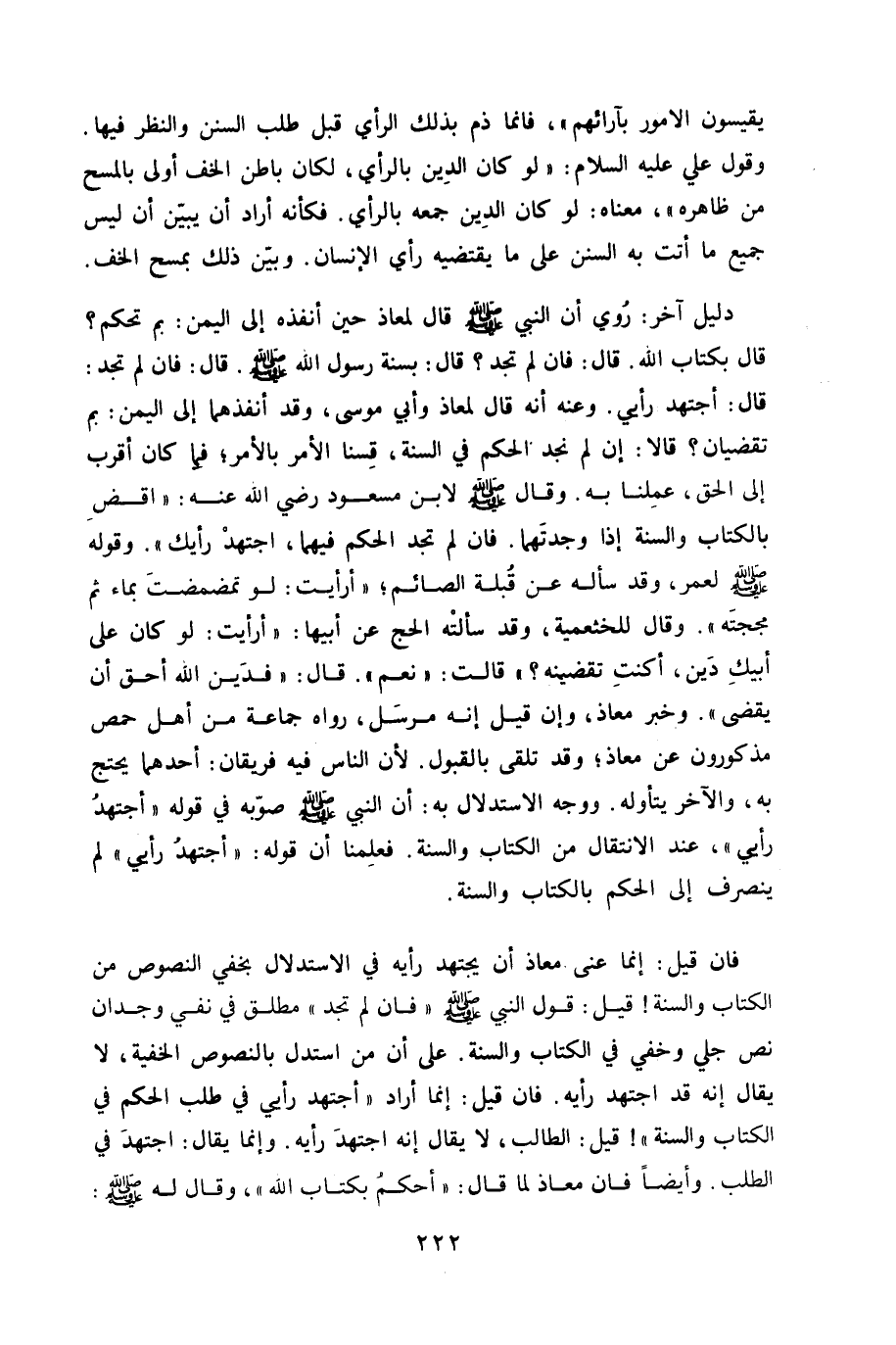 دَلِيل آخر رُوِيَ أَن النَّبِي صلى الله عَلَيْهِ وَسلم قَالَ لِمعَاذ حِين أنفذه إِلَى الْيمن بِمَ تحكم قَالَ بِكِتَاب الله قَالَ فان لم تَجِد قَالَ بِسنة رَسُول الله صلى الله عَلَيْهِ وَسلم قَالَ فان لم تَجِد قَالَ أجتهد رَأْيِي وَعنهُ أَنه قَالَ لِمعَاذ وَأبي مُوسَى وَقد أنفذهما إِلَى الْيمن بِمَ تقضيان قَالَا إِن لم نجد الحكم فِي السّنة قسنا الْأَمر بِالْأَمر فَمَا كَانَ اقْربْ إِلَى الْحق عَملنَا بِهِ وَقَالَ صلى الله عَلَيْهِ وَسلم لِابْنِ مَسْعُود رَضِي الله عَنهُ اقْضِ بِالْكتاب وَالسّنة إِذا وجدتهما فان لم تَجِد الحكم فيهمَا اجْتهد رايك وَقَوله صلى الله عَلَيْهِ وَسلم لعمر وَقد سَأَلَهُ عَن قبْلَة الصَّائِم أرايت لَو تمضمضت بِمَاء ثمَّ مججته وَقَالَ للخثعمية وَقد سَأَلته الْحَج عَن ابيها أَرَأَيْت لَو كَانَ على أَبِيك دين أَكنت تقضينه قَالَت نعم قَالَ فدين الله أَحَق أَن يقْضى وَخبر معَاذ وَإِن قيل إِنَّه مُرْسل رَوَاهُ جمَاعَة من أهل حمص مذكورون عَن معَاذ وَقد تلقى بِالْقبُولِ لِأَن النَّاس فِيهِ فريقان احدهما يحْتَج بِهِ وَالْآخر يتأوله وَوجه الِاسْتِدْلَال بِهِ أَن النَّبِي صلى الله عَلَيْهِ وَسلم صَوبه فِي قَوْله أجتهد رَأْيِي عِنْد الِانْتِقَال من الْكتاب وَالسّنة فَعلمنَا أَن قَوْله أجتهد رَأْيِي لم ينْصَرف إِلَى الحكم بِالْكتاب وَالسّنة