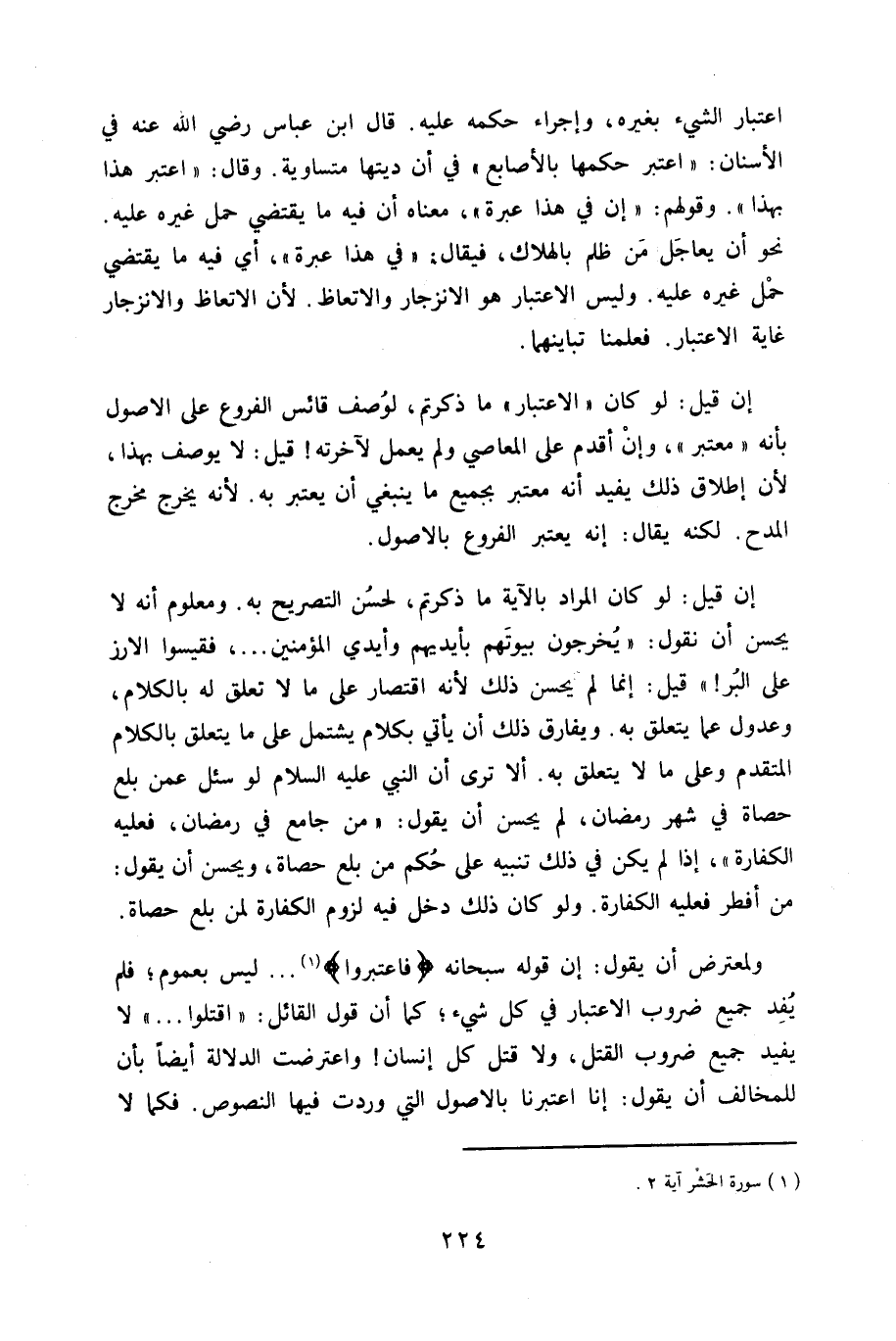 ولمعترض أَن يَقُول إِن قَوْله سُبْحَانَهُ {فاعتبروا} لَيْسَ بِعُمُوم فَلم يفد جَمِيع ضروب الِاعْتِبَار فِي كل شَيْء كَمَا أَن قَول الْقَائِل اقْتُلُوا لَا يُفِيد جَمِيع ضروب الْقَتْل وَلَا قتل كل إِنْسَان واعترضت الدّلَالَة أَيْضا بِأَن للمخالف أَن يَقُول إِنَّا اعْتبرنَا بالاصول الَّتِي وَردت فِيهَا النُّصُوص فَكَمَا لَا