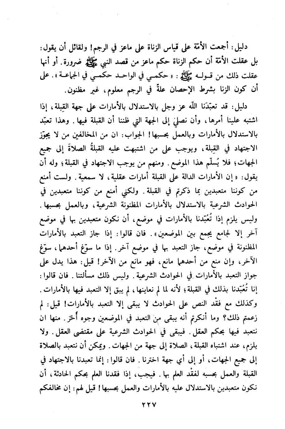 دَلِيل قد تعبدنا الله عز وَجل بالاستدلال بالأمارات على جِهَة الْقبْلَة إِذا اشْتبهَ علينا أمرهَا وَأَن نصلي إِلَى الْجِهَة الَّتِي ظننا أَن الْقبْلَة فِيهَا وَهَذَا تعبد بالاستدلال بالأمارات وبالعمل بحسبها الْجَواب ان من الْمُخَالفين من لَا يجوز الِاجْتِهَاد فِي الْقبْلَة وَيُوجب على من اشتبهت عَلَيْهِ الْقبْلَة الصَّلَاة إِلَى جَمِيع الْجِهَات فَلَا يسلم هذاالموضع وَمِنْهُم من يُوجب الِاجْتِهَاد فِي الْقبْلَة وَله أَن يَقُول إِن الأمارات الدَّالَّة على الْقبْلَة أَمَارَات عقلية لَا سمعية وَلست امْنَعْ من كوننا متعبدين بِمَا ذكرْتُمْ فِي الْقبْلَة وَلَكِنِّي أمنع من كوننا متعبدين فِي الْحَوَادِث الشَّرْعِيَّة بالاستدلال بالأمارات المظنونة الشَّرْعِيَّة وبالعمل بحسبها وَلَيْسَ يلْزم إِذا تعبدنا بالأمارات فِي مَوضِع أَن نَكُون متعبدين بهَا فِي مَوضِع آخر إِلَّا لجامع يجمع بَين الْمَوْضِعَيْنِ فان قَالُوا إِذا جَازَ التَّعَبُّد بالأمارات المظنونة فِي مَوضِع جَازَ التَّعَبُّد بهَا فِي مَوضِع آخر إِذا مَا سوغ احدهما سوغ الآخر وَإِن منع من احدهما مَانع فَهُوَ مَانع من الآخر قيل هَذَا يدل على جَوَاز التَّعَبُّد بالأمارات فِي الْحَوَادِث الشَّرْعِيَّة وَلَيْسَ ذَلِك مَسْأَلَتنَا فان قَالُوا إِنَّا تعبدنا بذلك فِي الْقبْلَة لِأَنَّهُ لما لم نعاينها لم يبْق إِلَّا التَّعَبُّد فِيهَا بالأمارات وَكَذَلِكَ مَعَ فقد النَّص على الْحَوَادِث لَا يبْقى إِلَّا التَّعَبُّد بالأمارات قيل لم زعمتم ذَلِك وَمَا أنكرتم أَنه يبْقى من التَّعَبُّد فِي الْمَوْضِعَيْنِ وُجُوه أخر مِنْهَا ان نتعبد فِيهَا بِحكم الْعقل فَيبقى فِي الْحَوَادِث الشَّرْعِيَّة على مُقْتَضى الْعقل وَلَا يلْزم عِنْد اشْتِبَاه الْقبْلَة الصَّلَاة إِلَى جِهَة من الْجِهَات وَيُمكن أَن نتعبد بِالصَّلَاةِ إِلَى جَمِيع الْجِهَات أَو إِلَى أَي جِهَة اخترنا فان قَالُوا إِنَّمَا تعبدنا بِالِاجْتِهَادِ فِي الْقبْلَة وَالْعَمَل بِحَسبِهِ لفقد الْعلم بهَا فَيجب إِذا فَقدنَا الْعلم بِحكم الْحَادِثَة أَن نَكُون متعبدين بالاستدلال عَلَيْهِ بالأمارات وَالْعَمَل بحسبها قيل لَهُم إِن مخالفكم