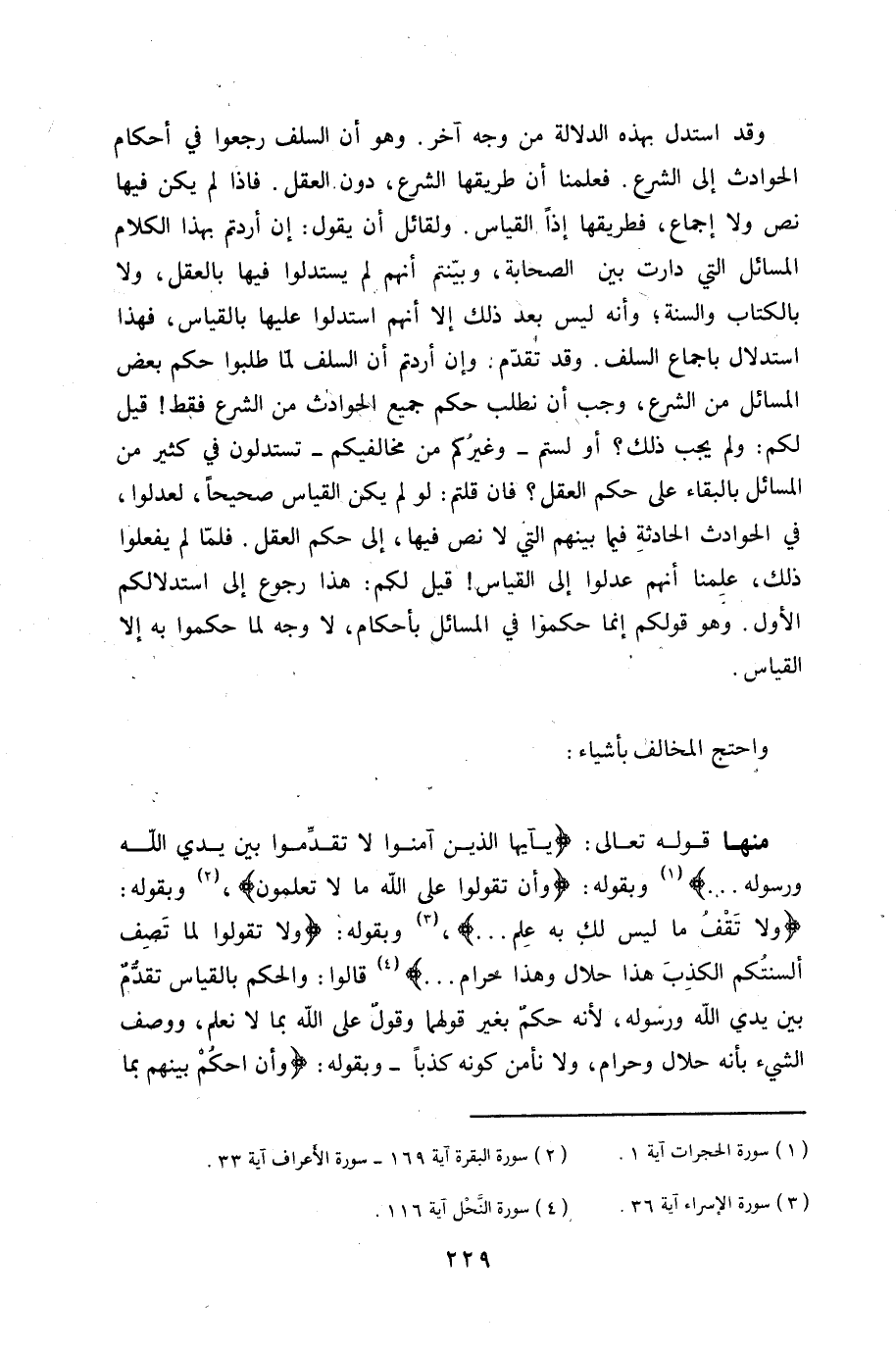 مِنْهَا قَوْله تَعَالَى {يَا أَيهَا الَّذين آمنُوا لَا تقدمُوا بَين يَدي الله وَرَسُوله} وَبِقَوْلِهِ {وَأَن تَقولُوا على الله مَا لَا تعلمُونَ} وَبِقَوْلِهِ {وَلَا تقف مَا لَيْسَ لَك بِهِ علم} وَبِقَوْلِهِ {وَلَا تَقولُوا لما تصف أَلْسِنَتكُم الْكَذِب هَذَا حَلَال وَهَذَا حرَام} قَالُوا وَالْحكم بِالْقِيَاسِ تقدم بَين يَدي الله وَرَسُوله لِأَنَّهُ حكم بِغَيْر قَوْلهمَا وَقَول على الله بِمَا لَا نعلم وَوصف الشَّيْء بِأَنَّهُ حَلَال وَحرَام وَلَا نَأْمَن كَونه كذبا وَبِقَوْلِهِ {وَأَن احكم بَينهم بِمَا أنزل الله}