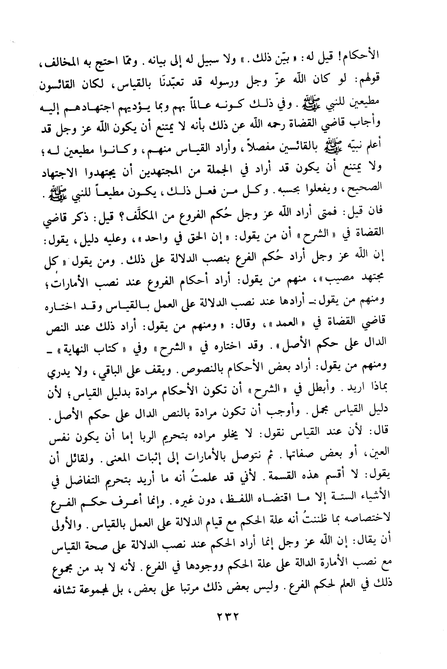 الْأَحْكَام قيل لَهُ بَين ذَلِك وَلَا سَبِيل لَهُ إِلَى بَيَانه وَمِمَّا احْتج بِهِ الْمُخَالف قَوْلهم لَو كَانَ الله عز وَجل وَرَسُوله قد تعبدنا بِالْقِيَاسِ لَكَانَ القائسون مُطِيعِينَ للنَّبِي صلى الله عَلَيْهِ وَسلم وَفِي ذَلِك كَونه عَالما بهم وَبِمَا يؤديهم اجتهادهم إِلَيْهِ وَأجَاب قَاضِي الْقُضَاة رَحمَه الله عَن ذَلِك بِأَنَّهُ لَا يمْتَنع أَن يكون الله عز وَجل قد أعلم نبيه صلى الله عَلَيْهِ وَسلم بالقائسين مفصلا وَأَرَادَ الْقيَاس مِنْهُم وَكَانُوا مُطِيعِينَ لَهُ وَلَا يمْتَنع أَن يكون قد أَرَادَ فِي الْجُمْلَة من الْمُجْتَهدين أَن يجتهدوا الِاجْتِهَاد الصَّحِيح ويفعلوا بِحَسبِهِ وكل من فعل ذَلِك يكون مُطيعًا للنَّبِي صلى الله عَلَيْهِ وَسلم فان قيل فَمَتَى أَرَادَ الله عز وَجل حكم الْفُرُوع من الْمُكَلف قيل ذكر قَاضِي الْقُضَاة فِي الشَّرْح أَن من يَقُول إِن الْحق فِي وَاحِد وَعَلِيهِ دَلِيل يَقُول إِن الله عز وَجل أَرَادَ حكم الْفَرْع بِنصب الدّلَالَة على ذَلِك وَمن يَقُول كل مُجْتَهد مُصِيب مِنْهُم من يَقُول أَرَادَ أَحْكَام الْفُرُوع عِنْد نصب الأمارات وَمِنْهُم من يَقُول أرادها عِنْد نصب الدّلَالَة على الْعَمَل بِالْقِيَاسِ وَقد اخْتَارَهُ قَاضِي الْقُضَاة فِي الْعمد وَقَالَ وَمِنْهُم من يَقُول أرادذلك عِنْد النَّص الدَّال على حكم الأَصْل وَقد اخْتَارَهُ فِي الشَّرْح وَفِي كتاب النِّهَايَة وَمِنْهُم من يَقُول أَرَادَ بعض الْأَحْكَام بالنصوص وَيقف على الْبَاقِي وَلَا يدْرِي بِمَاذَا أُرِيد وابطل فِي الشَّرْح أَن تكون الْأَحْكَام مُرَادة بِدَلِيل الْقيَاس لِأَن دَلِيل الْقيَاس مُجمل وَأوجب أَن تكون مُرَادة بِالنَّصِّ الدَّال على حكم الأَصْل قَالَ لِأَن عِنْد الْقيَاس نقُول لَا يَخْلُو مُرَاده بِتَحْرِيم الرِّبَا إِمَّا أَن يكون نفس الْعين أَو بعض صفاتها ثمَّ نتوصل بالأمارات إِلَى إِثْبَات الْمَعْنى وَلقَائِل أَن يَقُول لَا أقسم هَذِه الْقِسْمَة لِأَنِّي قد علمت أَنه مَا أُرِيد بِتَحْرِيم التَّفَاضُل فِي الْأَشْيَاء السِّتَّة إِلَّا مَا اقْتَضَاهُ اللَّفْظ دون غَيره وَإِنَّمَا أعرف حكم الْفَرْع لاختصاصه بِمَا ظَنَنْت أَنه عِلّة الحكم مَعَ قيام الدّلَالَة على الْعَمَل بِالْقِيَاسِ وَالْأولَى أَن يُقَال إِن الله عز وَجل إِنَّمَا أَرَادَ الحكم عِنْد نصب الدّلَالَة على صِحَة الْقيَاس مَعَ نصب الأمارة الدَّالَّة على عِلّة الحكم ووجودها فِي الْفَرْع لِأَنَّهُ لَا بُد من مَجْمُوع ذَلِك فِي الْعلم لحكم الْفَرْع وَلَيْسَ بعض ذَلِك مُرَتبا على بعض بل لمجموعة تشافه