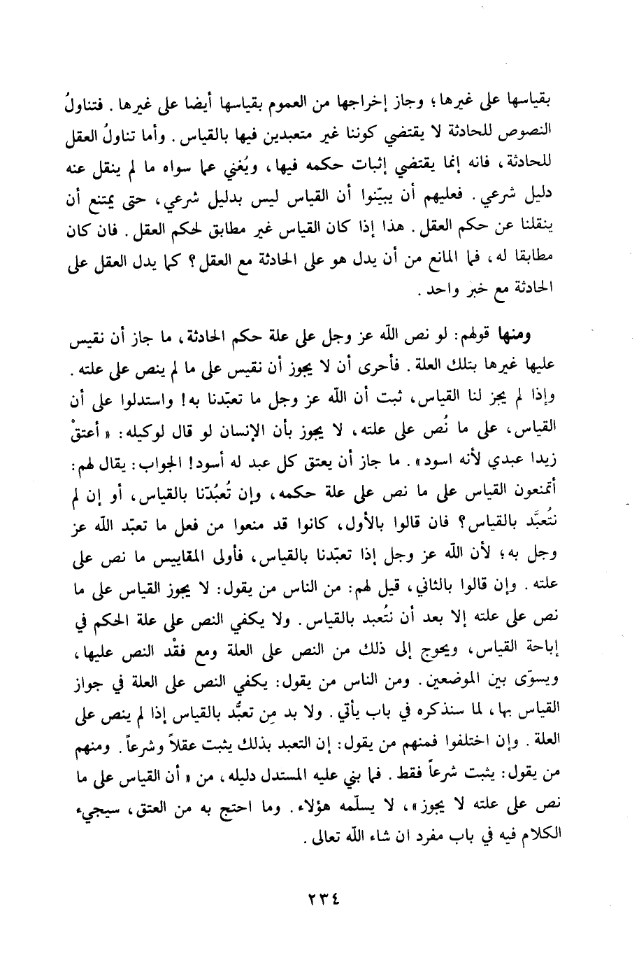 وَمِنْهَا قَوْلهم لَو نَص الله عز وَجل على عِلّة حكم الْحَادِثَة مَا جَازَ أَن نقيس عَلَيْهَا غَيرهَا بِتِلْكَ الْعلَّة فأحرى أَن لَا يجوز أَن نقيس على مَا لم ينص على علته وَإِذا لم يجز لنا الْقيَاس ثَبت أَن الله عز وَجل مَا تعبدنا بِهِ وَاسْتَدَلُّوا على أَن الْقيَاس على مَا نَص على علته لَا يجوز بِأَن الْإِنْسَان لَو قَالَ لوَكِيله أعتق زيدا عَبدِي لِأَنَّهُ اسود مَا جَازَ أَن يعْتق كل عبد لَهُ أسود الْجَواب يُقَال لَهُم أتمنعون الْقيَاس على مَا نَص على عِلّة حكمه وَإِن تعبدنا بِالْقِيَاسِ أَو إِن لم نتعبد بِالْقِيَاسِ فان قَالُوا بِالْأولِ كَانُوا قد منعُوا من فعل مَا تعبد الله عز وَجل بِهِ لِأَن الله عز وَجل إِذا تعبدنا بِالْقِيَاسِ فَأولى المقاييس مَا نَص على علته وَإِن قَالُوا بِالثَّانِي قيل لَهُم من النَّاس من يَقُول لَا يجوز الْقيَاس على مَا نَص على علته إِلَّا بعد أَن نتعبد بِالْقِيَاسِ وَلَا يَكْفِي النَّص على عِلّة الحكم فِي إِبَاحَة الْقيَاس ويحوج إِلَى ذَلِك من النَّص على الْعلَّة وَمَعَ فقد النَّص عَلَيْهَا ويسوى بَين الْمَوْضِعَيْنِ وَمن النَّاس من يَقُول يَكْفِي النَّص على الْعلَّة فِي جَوَاز الْقيَاس بهَا لما سَنذكرُهُ فِي بَاب ياتي وَلَا بُد من تعبد بِالْقِيَاسِ إِذا لم ينص على الْعلَّة وَإِن اخْتلفُوا فَمنهمْ من يَقُول إِن التَّعَبُّد بذلك يثبت عقلا وَشرعا وَمِنْهُم من يَقُول يثبت شرعا فَقَط فَمَا بني عَلَيْهِ الْمُسْتَدلّ دَلِيله من أَن الْقيَاس على مَا نَص على علته لَا يجوز لَا يُسلمهُ هَؤُلَاءِ وَمَا احْتج بِهِ من الْعتْق سَيَجِيءُ الْكَلَام فِيهِ فِي بَاب مُفْرد أَن شَاءَ الله تَعَالَى