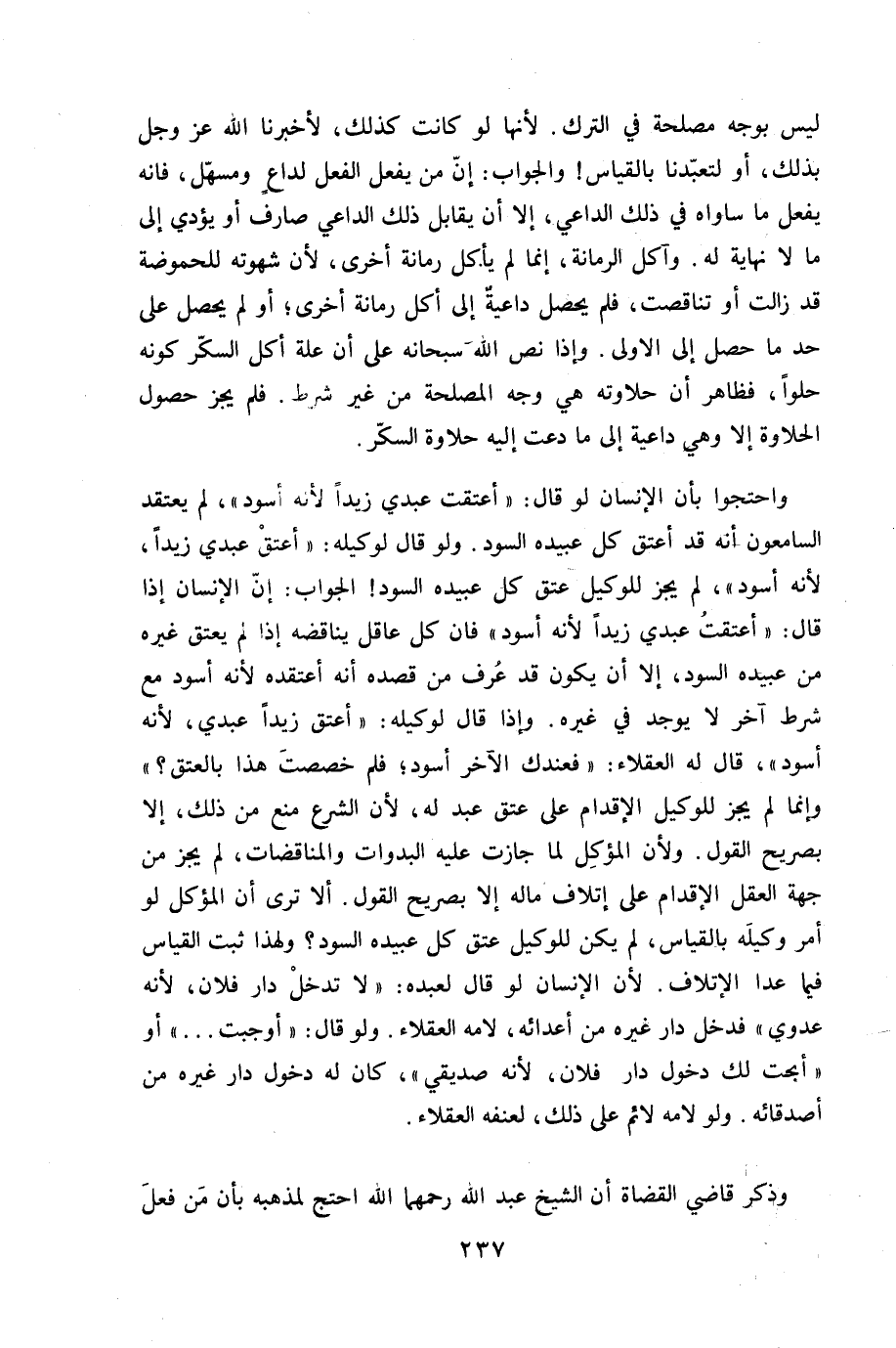 وَاحْتَجُّوا بِأَن الْإِنْسَان لَو قَالَ أعتقت عَبدِي زيدا لِأَنَّهُ اسود لم يعْتَقد السامعون أَنه قد أعتق كل عبيده السود وَلَو قَالَ لوَكِيله أعتق عَبدِي زيدا لِأَنَّهُ أسود لم يجز للْوَكِيل عتق كل عبيده السود الْجَواب إِن الْإِنْسَان إِذا قَالَ أعتقت عَبدِي زيدا لِأَنَّهُ أسود فان كل عَاقل يناقضه إِذا لم يعْتق غَيره من عبيده السود إِلَّا أَن يكون قد عرف من قَصده أَنه اعتقده لِأَنَّهُ أسود مَعَ شَرط آخر لَا يُوجد فِي غَيره وَإِذا قَالَ لوَكِيله أعتق زيدا عَبدِي لِأَنَّهُ أسود قَالَ لَهُ الْعُقَلَاء فعندك الآخر أسود فَلم خصصت هَذَا بِالْعِتْقِ وَإِنَّمَا لم يجز للْوَكِيل الْإِقْدَام على عتق عبد لَهُ لِأَن الشَّرْع منع من ذَلِك إِلَّا بِصَرِيح القَوْل وَلِأَن المؤكل لما جَازَت عَلَيْهِ البدوات والمناقضات لم يجز من جِهَة الْعقل الْإِقْدَام على إِتْلَاف مَاله إِلَّا بِصَرِيح القَوْل أَلا ترى أَن المؤكل لَو أَمر وَكيله بِالْقِيَاسِ لم يكن للْوَكِيل عتق كل عبيده السود وَلِهَذَا ثَبت الْقيَاس فِيمَا عدا الْإِتْلَاف لِأَن الْإِنْسَان لَو قَالَ لعَبْدِهِ لَا تدخل دَار فلَان لِأَنَّهُ عدوي فَدخل دَار غَيره من أعدائه لامه الْعُقَلَاء وَلَو قَالَ أوجبت أَو أبحت لَك دُخُول دَار فلَان لِأَنَّهُ صديقي كَانَ لَهُ دُخُول دَار غَيره من أصدقائه وَلَو لامه لائم على ذَلِك لعنفه الْعُقَلَاء