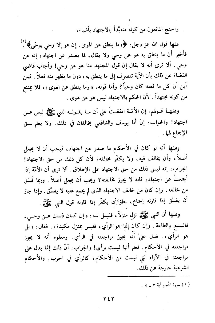 مِنْهَا قَول الله عز وَجل {وَمَا ينْطق عَن الْهوى إِن هُوَ إِلَّا وَحي يُوحى} فَأخْبر أَن مَا ينْطق بِهِ هُوَ عَن وَحي وَلَا يُقَال لما يصدر عَن اجْتِهَاد إِنَّه عَن وَحي أَلا ترى أَنه لَا يُقَال إِن قَول الْمُجْتَهد منا هُوَ عَن وَحي وَأجَاب قَاضِي الْقُضَاة عَن ذَلِك بِأَن الْآيَة تَنْصَرِف إِلَى مَا ينْطق بِهِ دون مَا يظْهر مِنْهُ فعلا فَمن أَيْن أَن كل مَا فعله كَانَ وَحيا وَأما قَوْله وَمَا ينْطق عَن الْهوى فَلَا يمْتَنع من كَونه مُجْتَهدا لِأَن الحكم بِالِاجْتِهَادِ لَيْسَ هُوَ عَن هوى
