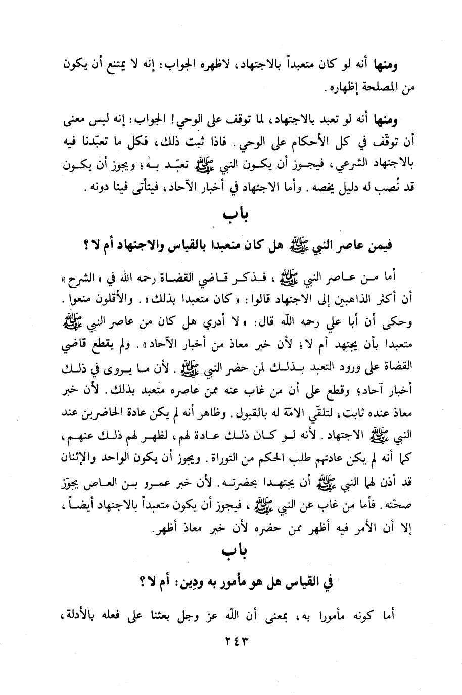 وَمِنْهَا أَنه لَو تعبد بِالِاجْتِهَادِ لما توقف على الْوَحْي الْجَواب إِنَّه لَيْسَ معنى أَن توقف فِي كل الْأَحْكَام على الْوَحْي فاذا ثَبت ذَلِك فَكل مَا تعبدنا فِيهِ بِالِاجْتِهَادِ الشَّرْعِيّ فَيجوز أَن يكون النَّبِي صلى الله عَلَيْهِ وَسلم تعبد بِهِ وَيجوز أَن يكون قد نصب لَهُ دَلِيل يَخُصُّهُ وَأما الِاجْتِهَاد فِي أَخْبَار الْآحَاد فيتأتى فِينَا دونه - صَلَّى اللَّهُ عَلَيْهِ وَسَلَّم َ - بَاب فِيمَن عاصر النَّبِي صلى الله عَلَيْهِ وَسلم هَل كَانَ متعبدا بِالْقِيَاسِ وَالِاجْتِهَاد أم لَا - صَلَّى اللَّهُ عَلَيْهِ وَسَلَّم َ -