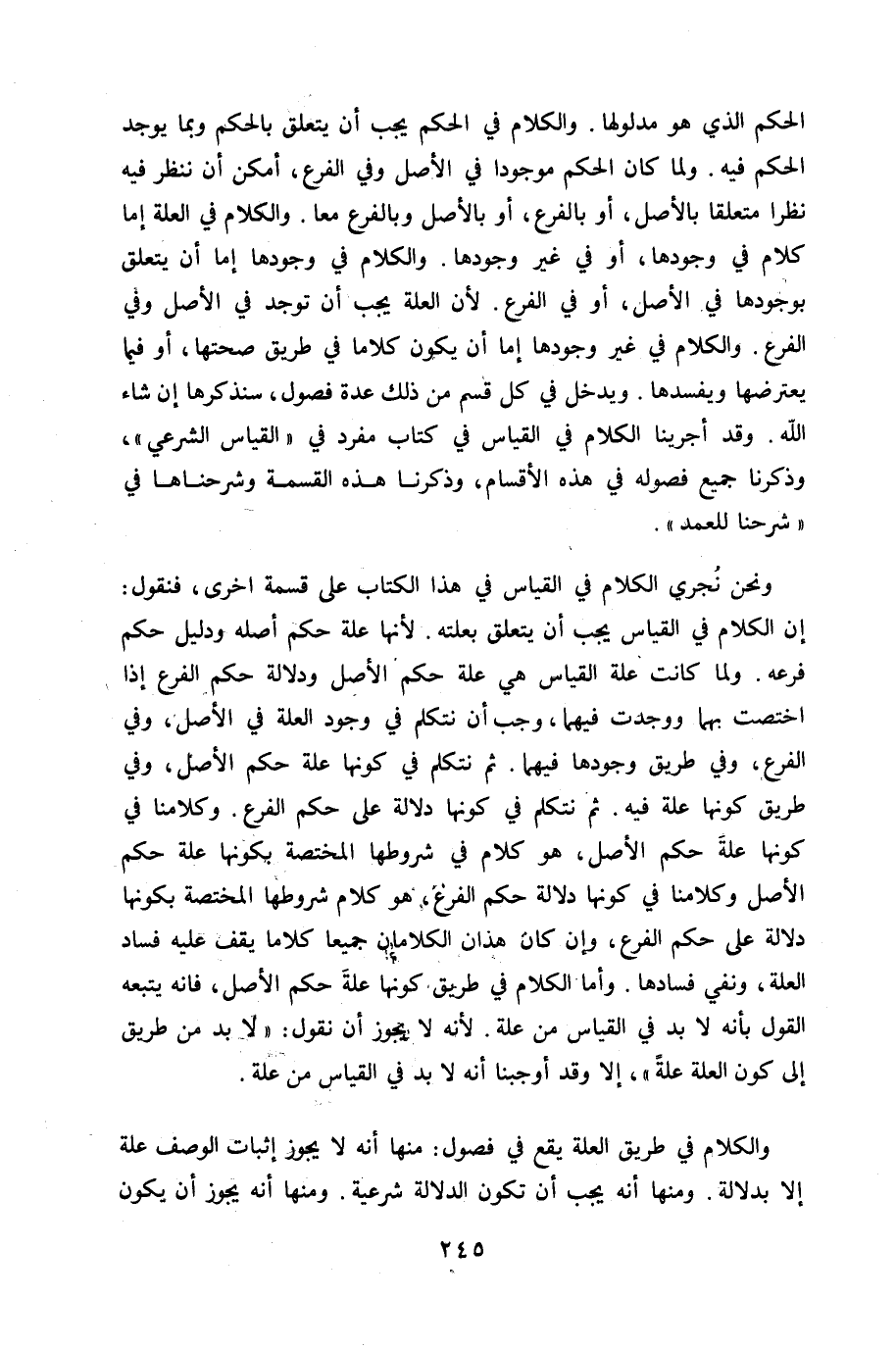 وَنحن نجري الْكَلَام فِي الْقيَاس فِي هَذَا الْكتاب على قسْمَة اخرى فَنَقُول إِن الْكَلَام فِي الْقيَاس يجب أَن يتَعَلَّق بعلته لِأَنَّهَا عِلّة حكم أَصله وَدَلِيل حكم فَرعه وَلما كَانَت عِلّة الْقيَاس هِيَ عِلّة حكم الأَصْل وَدلَالَة حكم الْفَرْع إِذا اخْتصّت بهما وَوجدت فيهمَا وَجب أَن نتكلم فِي وجود الْعلَّة فِي الأَصْل وَفِي الْفَرْع وَفِي طَرِيق وجودهَا فيهمَا ثمَّ نتكلم فِي كَونهَا عِلّة حكم الأَصْل وَفِي طَرِيق كَونهَا عِلّة فِيهِ ثمَّ نتكلم فِي كَونهَا دلَالَة على حكم الْفَرْع وكلامنا فِي كَونهَا عِلّة حكم الأَصْل هُوَ كَلَام فِي شُرُوطهَا المختصة بِكَوْنِهَا عِلّة حكم الأَصْل وكلامنا فِي كَونهَا دلَالَة حكم الْفَرْع هُوَ كَلَام شُرُوطهَا المختصة بِكَوْنِهَا دلَالَة على حكم الْفَرْع وَإِن كَانَ هَذَانِ الكلامان جَمِيعًا كلَاما يقف عَلَيْهِ فَسَاد الْعلَّة وَنفي فَسَادهَا وَأما الْكَلَام فِي طَرِيق كَونهَا عِلّة حكم الأَصْل فانه يتبعهُ القَوْل بِأَنَّهُ لَا بُد فِي الْقيَاس من عِلّة لِأَنَّهُ لَا يجوز أَن نقُول لَا بُد من طَرِيق إِلَى كَون الْعلَّة عِلّة إِلَّا وَقد أَوجَبْنَا انه لَا بُد فِي الْقيَاس من عِلّة