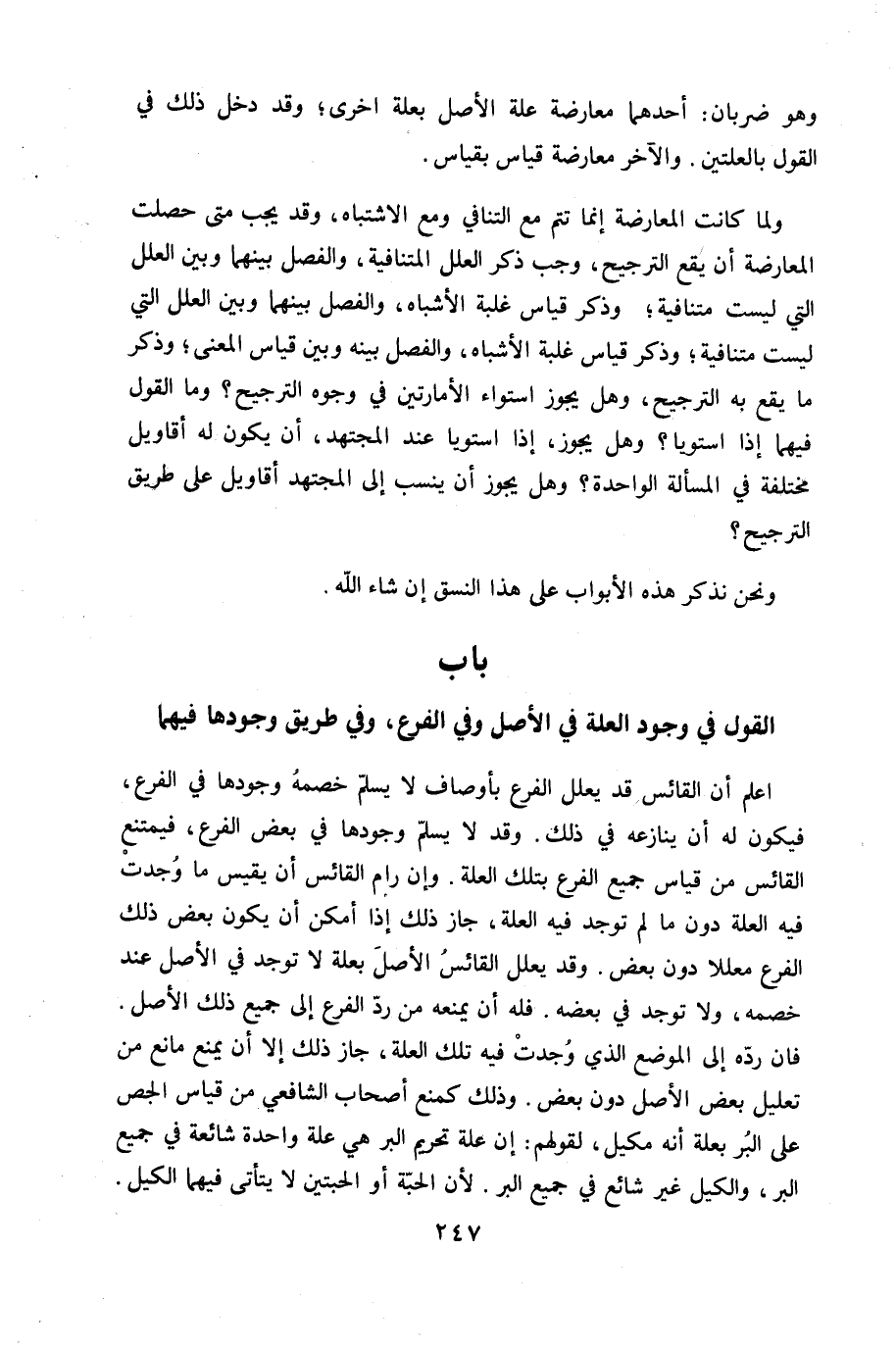 وَلما كَانَت الْمُعَارضَة إِنَّمَا تتمّ مَعَ التَّنَافِي وَمَعَ الِاشْتِبَاه وَقد يجب مَتى حصلت الْمُعَارضَة أَن يَقع التَّرْجِيح وَجب ذكر الْعِلَل المتنافية والفصل بَينهمَا وَبَين الْعِلَل الَّتِي لَيست متنافية وَذكر قِيَاس غَلَبَة الْأَشْبَاه والفصل بَينهمَا وَبَين الْعِلَل الَّتِي لَيست متنافية وَذكر قِيَاس غَلَبَة الْأَشْبَاه والفصل بَينه وَبَين قِيَاس الْمَعْنى وَذكر مَا يَقع بِهِ التَّرْجِيح وَهل يجوز اسْتِوَاء الأمارتين فِي وُجُوه التَّرْجِيح وَمَا القَوْل فيهمَا إِذا اسْتَويَا وَهل يجوز إِذا اسْتَويَا عِنْد الْمُجْتَهد أَن يكون لَهُ اقاويل مُخْتَلفَة فِي الْمَسْأَلَة الْوَاحِدَة وَهل يجوز أَن ينْسب إِلَى الْمُجْتَهد أقاويل على طَرِيق التَّرْجِيح