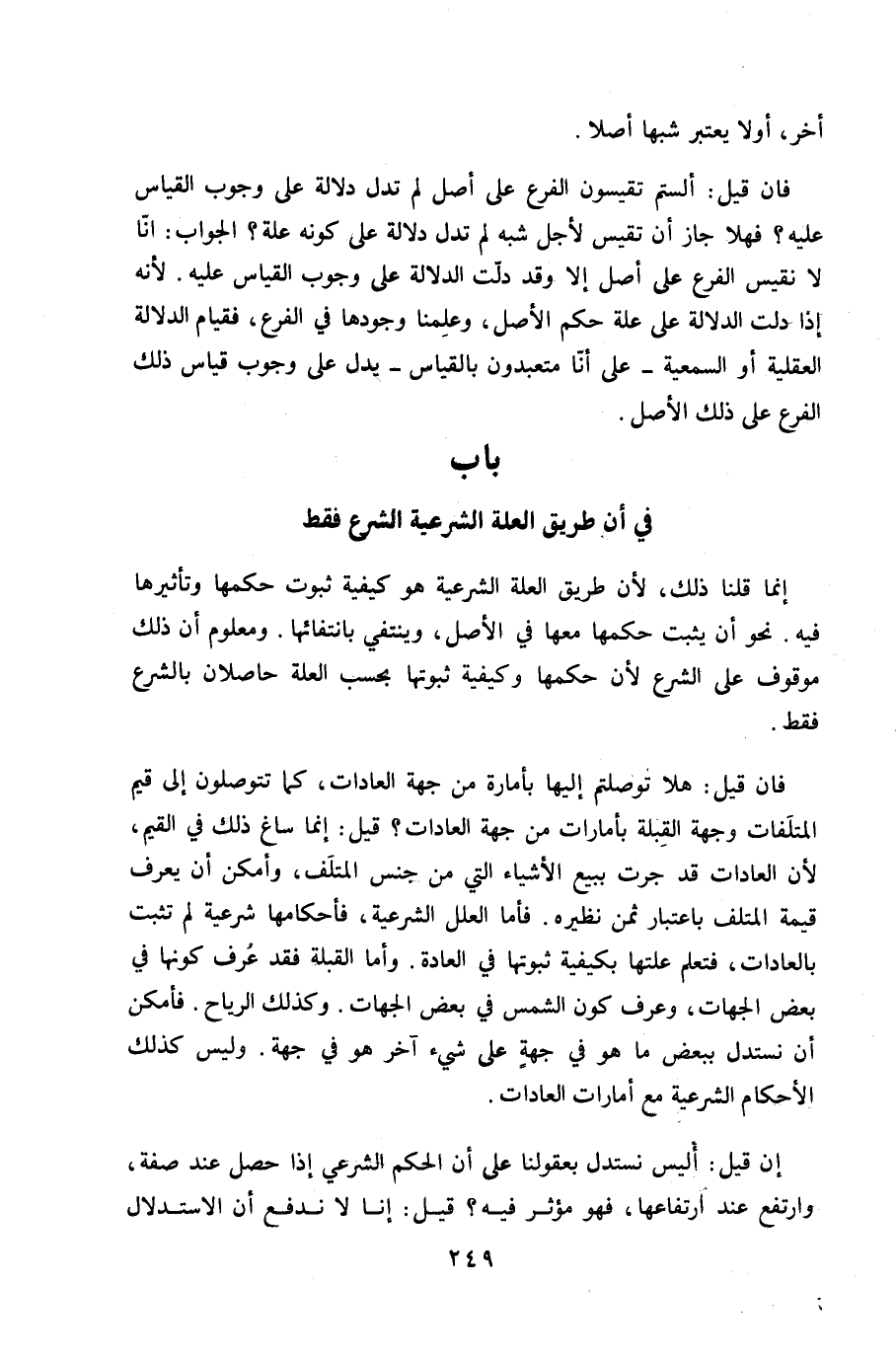 فان قيل ألستم تقيسون الْفَرْع على أصل لم تدل دلَالَة على وجوب الْقيَاس عَلَيْهِ فَهَلا جَازَ أَن تقيس لأجل شبه لم تدل دلَالَة على كَونه عِلّة الْجَواب أَنا لَا نقيس الْفَرْع على اصل إِلَّا وَقد دلّت الدّلَالَة على وجوب الْقيَاس عَلَيْهِ لِأَنَّهُ إِذا دلّت الدّلَالَة على عِلّة حكم الأَصْل وَعلمنَا وجودهَا فِي الْفَرْع فقيام الدّلَالَة الْعَقْلِيَّة أَو السمعية على أَنا متعبدون بِالْقِيَاسِ يدل على وجوب قِيَاس ذَلِك الْفَرْع على ذَلِك الأَصْل - صَلَّى اللَّهُ عَلَيْهِ وَسَلَّم َ - بَاب فِي أَن طَرِيق الْعلَّة الشَّرْعِيَّة الشَّرْع فَقَط - صَلَّى اللَّهُ عَلَيْهِ وَسَلَّم َ -