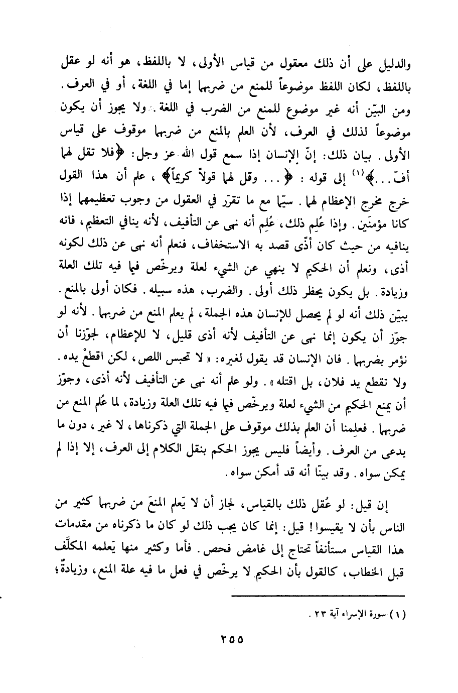 وَالدَّلِيل على أَن ذَلِك مَعْقُول من قِيَاس الأولى لَا بِاللَّفْظِ هُوَ أَنه لَو عقل بِاللَّفْظِ لَكَانَ اللَّفْظ مَوْضُوعا للْمَنْع من ضربهما إِمَّا فِي اللُّغَة اَوْ فِي الْعرف وَمن الْبَين أَنه غير مَوْضُوع للْمَنْع من الضَّرْب فِي اللُّغَة وَلَا يجوز أَن يكون مَوْضُوعا لذَلِك فِي الْعرف لِأَن الْعلم بِالْمَنْعِ من ضربهما مَوْقُوف على قِيَاس الأولى بَيَان ذَلِك إِن الْإِنْسَان إِذا سمع قَول الله عز وَجل {فَلَا تقل لَهما أُفٍّ} إِلَى قَوْله {وَقل لَهما قولا كَرِيمًا} علم أَن هَذَا القَوْل خرج مخرج الإعظام لَهما سِيمَا مَعَ مَا تقرر فِي الْعُقُول من وجوب تعظيمهما إِذا كَانَا مُؤمنين وَإِذا علم ذَلِك علم أَنه نهى عَن التأفيف لِأَنَّهُ يُنَافِي التَّعْظِيم فانه يُنَافِيهِ من حَيْثُ كَانَ أَذَى قصد بِهِ الاستخفاف فنعلم أَنه نهى عَن ذَلِك لكَونه أَذَى ونعلم أَن الْحَكِيم لَا ينْهَى عَن الشَّيْء لعِلَّة ويرخص فِيمَا فِيهِ تِلْكَ الْعلَّة وَزِيَادَة بل يكون يحظر ذَلِك أولى وَالضَّرْب هَذِه سَبيله فَكَانَ أولى بِالْمَنْعِ يبين ذَلِك أَنه لَو لم يحصل للْإنْسَان هَذِه الْجُمْلَة لم يعلم الْمَنْع من ضربهما لِأَنَّهُ لَو جوز أَن يكون إِنَّمَا نهى عَن التأفيف لِأَنَّهُ أَذَى قَلِيل لَا للإعظام لجوزنا أَن نؤمر بضربهما فان الْإِنْسَان قد يَقُول لغيره لَا تحبس اللص لَكِن اقْطَعْ يَده وَلَا تقطع يَد فلَان بل اقتله وَلَو علم أَنه نهى عَن التأفيف لِأَنَّهُ أَذَى وَجوز أَن يمْنَع الْحَكِيم من الشَّيْء لعِلَّة ويرخص فِيمَا فِيهِ تِلْكَ الْعلَّة وَزِيَادَة لما علم الْمَنْع من ضربهما فَعلمنَا أَن الْعلم بذلك مَوْقُوف على الْجُمْلَة الَّتِي ذَكرنَاهَا لَا غير دون مَا يدعى من الْعرف وَأَيْضًا فَلَيْسَ يجوز الحكم بِنَقْل الْكَلَام إِلَى الْعرف إِلَّا إِذا لم يُمكن سواهُ وَقد بَينا أَنه قد أمكن سواهُ