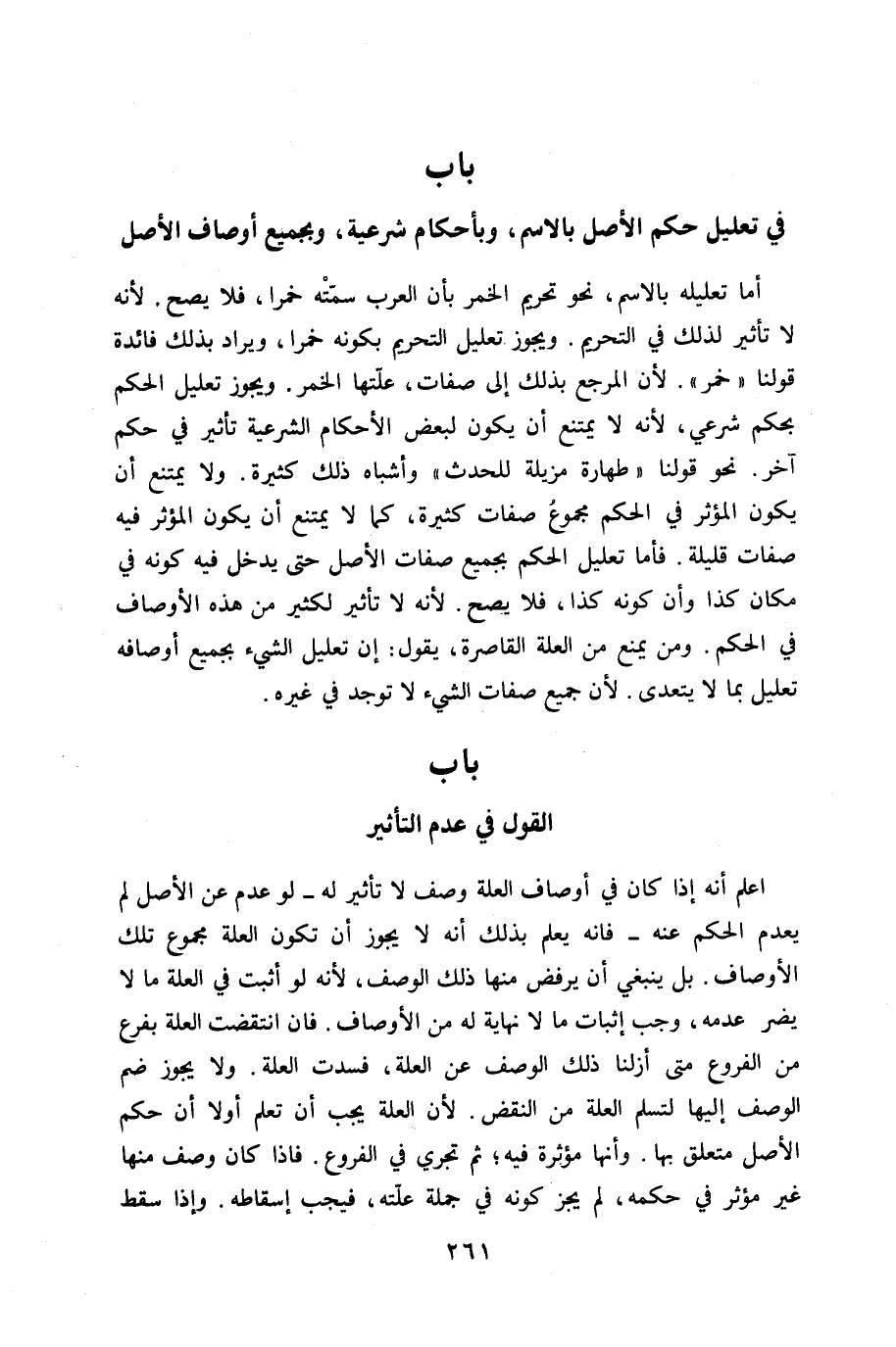 أما تَعْلِيله بِالِاسْمِ نَحْو تَحْرِيم الْخمر بَان الْعَرَب سمته خمرًا فَلَا يَصح لِأَنَّهُ لَا تَأْثِير لذَلِك فِي التَّحْرِيم وَيجوز تَعْلِيل التَّحْرِيم بِكَوْنِهِ خمرًا وَيُرَاد بذلك فَائِدَة قَوْلنَا خمر لِأَن الْمرجع بذلك إِلَى صِفَات علتها الْخمر وَيجوز تَعْلِيل الحكم بِحكم شَرْعِي لِأَنَّهُ لَا يمْتَنع أَن يكون لبَعض الْأَحْكَام الشَّرْعِيَّة تَأْثِير فِي حكم آخر نَحْو قَوْلنَا طَهَارَة مزيلة للْحَدَث وَأَشْبَاه ذَلِك كَثِيرَة وَلَا يمْتَنع أَن يكون الْمُؤثر فِي الحكم مَجْمُوع صِفَات كَثِيرَة كَمَا لَا يمْتَنع أَن يكون الْمُؤثر فِيهِ صِفَات قَليلَة فاما تَعْلِيل الحكم بِجَمِيعِ صِفَات الأَصْل حَتَّى يدْخل فِيهِ كَونه فِي مَكَان كَذَا وَأَن كَونه كَذَا فَلَا يَصح لِأَنَّهُ لَا تَأْثِير لكثير من هَذِه الْأَوْصَاف فِي الحكم وَمن يمْنَع من الْعلَّة القاصرة يَقُول إِن تَعْلِيل الشَّيْء بِجَمِيعِ أَوْصَافه تَعْلِيل بِمَا لَا يتَعَدَّى لِأَن جَمِيع صِفَات الشَّيْء لَا تُوجد فِي غَيره - صَلَّى اللَّهُ عَلَيْهِ وَسَلَّم َ - بَاب القَوْل فِي عدم التَّأْثِير - صَلَّى اللَّهُ عَلَيْهِ وَسَلَّم َ -