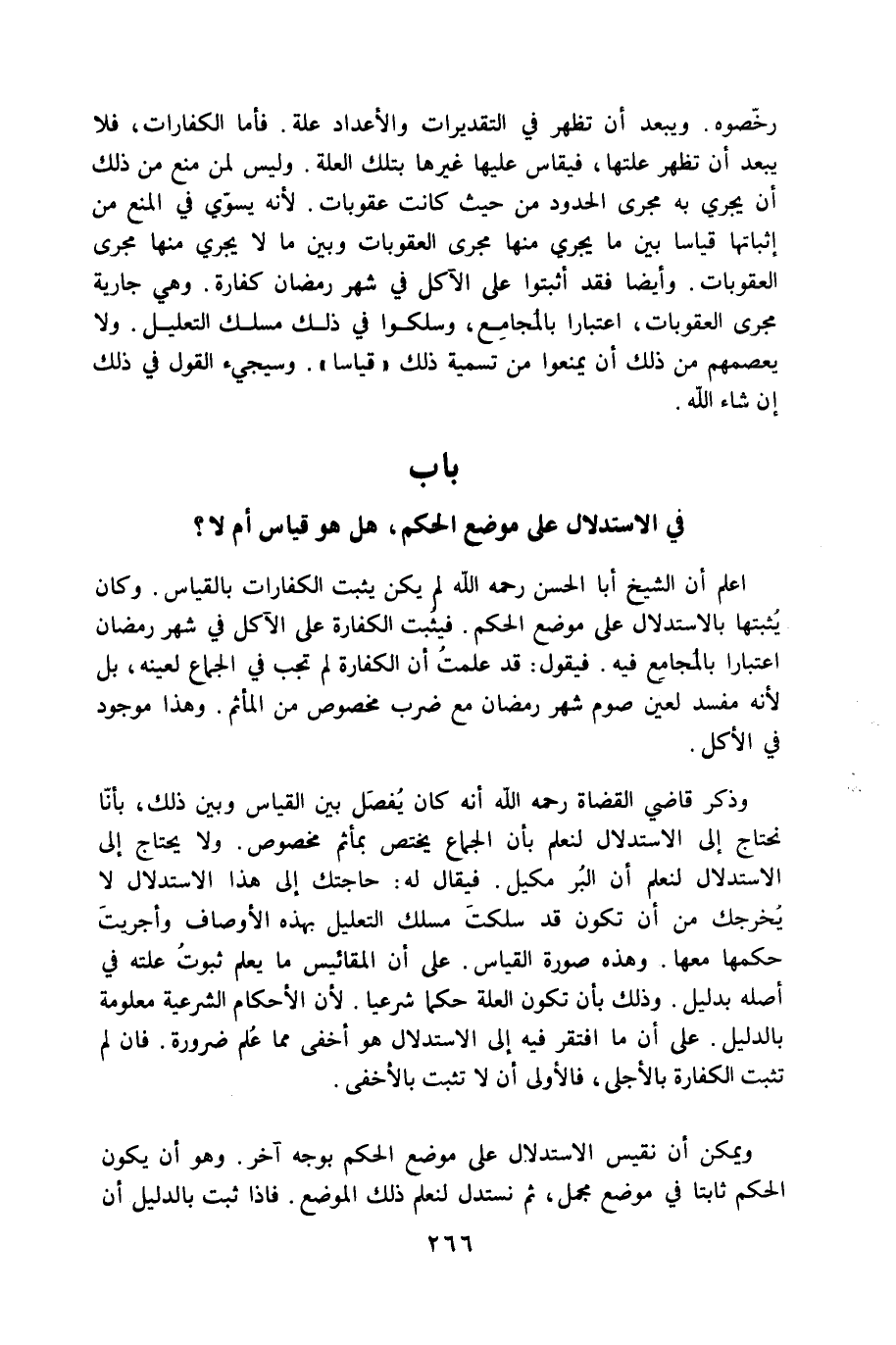 رخصوه وَيبعد أَن تظهر فِي التقديرات والأعداد عِلّة فاما الْكَفَّارَات فَلَا يبعد أَن تظهر علتها فيقاس عَلَيْهَا غَيرهَا بِتِلْكَ الْعلَّة وَلَيْسَ لمن منع من ذَلِك أَن يجْرِي بِهِ مجْرى الْحُدُود من حَيْثُ كَانَت عقوبات لِأَنَّهُ يُسَوِّي فِي الْمَنْع من إِثْبَاتهَا قِيَاسا بَين مَا يجْرِي مِنْهَا مجْرى الْعُقُوبَات وَبَين مَا لَا يجْرِي مِنْهَا مجْرى الْعُقُوبَات وَأَيْضًا فقد أثبتوا على الْآكِل فِي شهر رَمَضَان كَفَّارَة وَهِي جَارِيَة مجْرى الْعُقُوبَات اعْتِبَارا بالمجامع وسلكوا فِي ذَلِك مَسْلَك التَّعْلِيل وَلَا يعصمهم من ذَلِك أَن يمتنعوا من تَسْمِيَة ذَلِك قِيَاسا وَسَيَجِيءُ القَوْل فِي ذَلِك إِن شَاءَ الله - صَلَّى اللَّهُ عَلَيْهِ وَسَلَّم َ - بَاب فِي الِاسْتِدْلَال على مَوضِع الحكم هَل هُوَ قِيَاس أم لَا - صَلَّى اللَّهُ عَلَيْهِ وَسَلَّم َ -