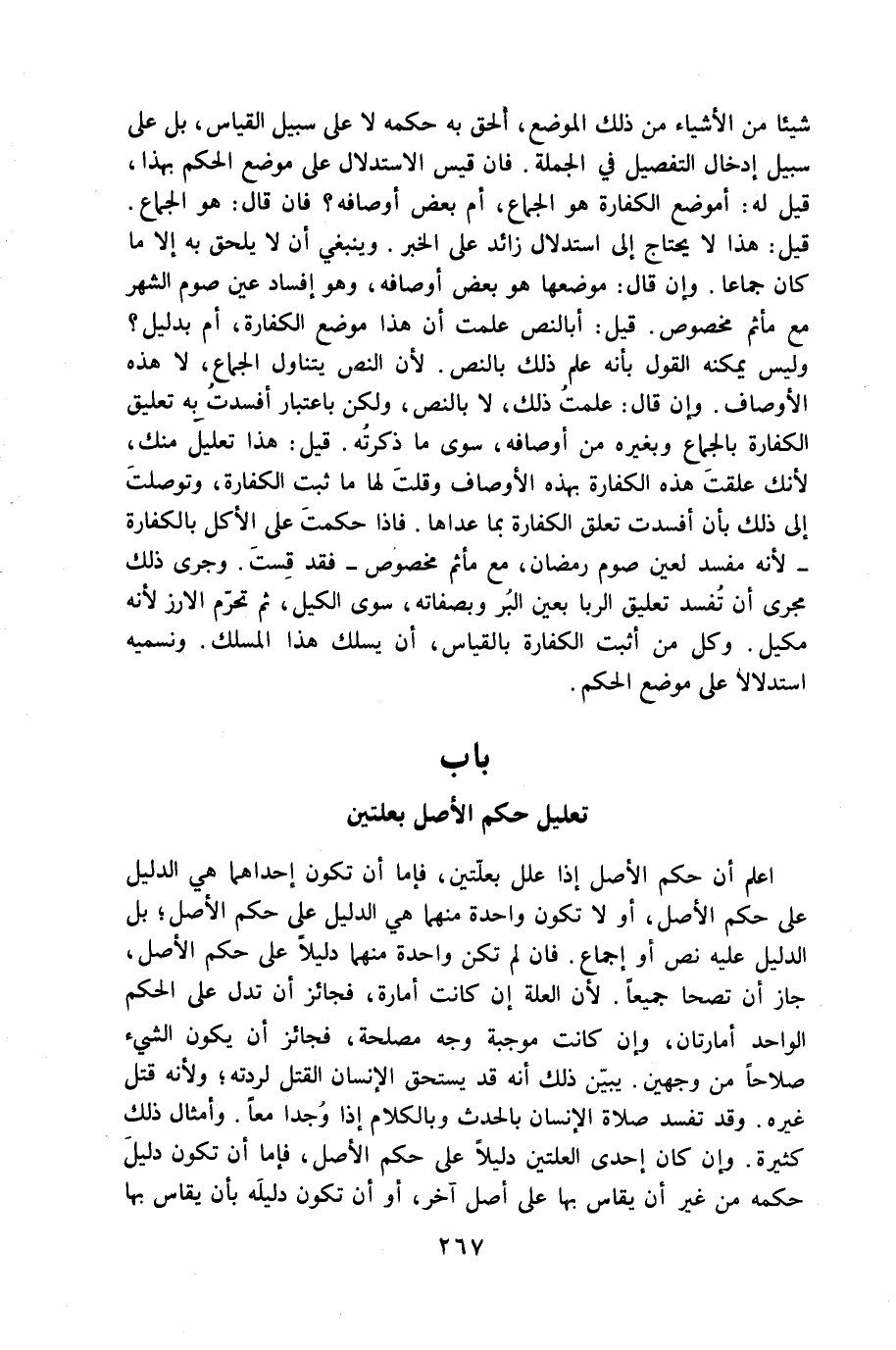 شَيْئا من الْأَشْيَاء من ذَلِك الْموضع ألحق بِهِ حكمه لَا على سَبِيل الْقيَاس بل على سَبِيل إِدْخَال التَّفْصِيل فِي الْجُمْلَة فان قيس الِاسْتِدْلَال على مَوضِع الحكم بِهَذَا قيل لَهُ أموضع الْكَفَّارَة هُوَ الْجِمَاع أم بعض أَوْصَافه فان قَالَ هُوَ الْجِمَاع قيل هَذَا لَا يحْتَاج إِلَى اسْتِدْلَال زَائِد على الْخَبَر وَيَنْبَغِي أَن لَا يلْحق بِهِ إِلَّا مَا كَانَ جماعا وَإِن قَالَ موضعهَا هُوَ بعض أَوْصَافه وَهُوَ إِفْسَاد عين صَوْم الشَّهْر مَعَ مأثم مَخْصُوص قيل ابالنص علمت أَن هَذَا مَوضِع الْكَفَّارَة أم بِدَلِيل وَلَيْسَ يُمكنهُ القَوْل بِأَنَّهُ علم ذَلِك بِالنَّصِّ لِأَن النَّص يتَنَاوَل الْجِمَاع لَا هَذِه الْأَوْصَاف وَإِن قَالَ علمت ذَلِك لَا بِالنَّصِّ وَلَكِن بِاعْتِبَار أفسدت بِهِ تَعْلِيق الْكَفَّارَة بِالْجِمَاعِ وَبِغَيْرِهِ من أَوْصَافه سوى مَا ذكرته قيل هَذَا تَعْلِيل مِنْك لِأَنَّك علقت هَذِه الْكَفَّارَة بِهَذِهِ الْأَوْصَاف وَقلت لَهَا مَا ثَبت الْكَفَّارَة وتوصلت إِلَى ذَلِك بِأَن أفسدت تعلق الْكَفَّارَة بِمَا عَداهَا فاذا حكمت على الْأكل بِالْكَفَّارَةِ لِأَنَّهُ مُفسد لعين صَوْم رَمَضَان مَعَ مأثم مَخْصُوص فقد قست وَجرى ذَلِك مجْرى أَن تفْسد تَعْلِيق الرِّبَا بِعَين الْبر وبصفاته سوى الْكَيْل ثمَّ تحرم الارز لِأَنَّهُ مَكِيل وكل من أثبت الْكَفَّارَة بِالْقِيَاسِ أَن يسْلك هَذَا المسلك ونسميه اسْتِدْلَالا على مَوضِع الحكم - صَلَّى اللَّهُ عَلَيْهِ وَسَلَّم َ - بَاب تَعْلِيل حكم الأَصْل بعلتين - صَلَّى اللَّهُ عَلَيْهِ وَسَلَّم َ -
