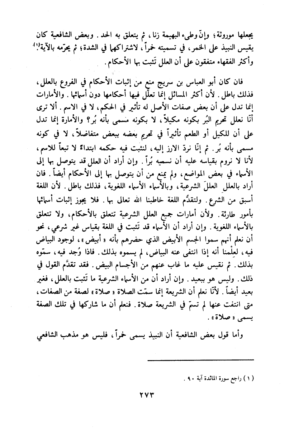 فان كَانَ أَبُو الْعَبَّاس بن سُرَيج منع من إِثْبَات الْأَحْكَام فِي الْفَرْع بالعلل فَذَلِك بَاطِل لِأَن أَكثر الْمسَائِل إِنَّمَا تعلل فِيهَا أَحْكَامهَا دون أسمائها والأمارات إِنَّمَا تدل على أَن بعض صِفَات الأَصْل لَهُ تَأْثِير فِي الحكم لَا فِي الِاسْم أَلا ترى أَنا نعلل تَحْرِيم الْبر بِكَوْنِهِ مَكِيلًا لَا بِكَوْنِهِ مُسَمّى بِأَنَّهُ بر والأمارة إِنَّمَا تدل على أَن للكيل أَو الطّعْم تَأْثِيرا فِي تَحْرِيم بعضه بِبَعْض مُتَفَاضلا لَا فِي كَونه مُسَمّى بِأَنَّهُ بر ثمَّ إِنَّا نرد الارز إِلَيْهِ لنثبت فِيهِ حكمه ابْتِدَاء لَا تبعا للاسم لأَنا لَا نروم بقياسه عَلَيْهِ أَن نُسَمِّيه برا وَإِن أَرَادَ أَن الْعِلَل قد يتَوَصَّل بهَا إِلَى الْأَسْمَاء فِي بعض الْمَوَاضِع وَلم يمْنَع من أَن يتَوَصَّل بهَا إِلَى الْأَحْكَام أَيْضا فان أَرَادَ بالعلل الْعِلَل الشَّرْعِيَّة وبالأسماء الْأَسْمَاء اللُّغَوِيَّة فَذَلِك بَاطِل لِأَن اللُّغَة أسبق من الشَّرْع ولتقدم اللُّغَة خاطبنا الله تَعَالَى بهَا فَلَا يجوز إِثْبَات أسمائها بِأُمُور طارئة وَلِأَن أَمَارَات جَمِيع الْعِلَل الشَّرْعِيَّة تتَعَلَّق بِالْأَحْكَامِ وَلَا تتَعَلَّق بالأسماء اللُّغَوِيَّة وَإِن أَرَادَ أَن الْأَسْمَاء قد تثبت فِي اللُّغَة بِقِيَاس غير شَرْعِي نَحْو أَن نعلم أَنهم سموا الْجِسْم الْأَبْيَض الَّذِي حضرهم بِأَنَّهُ أَبيض لوُجُود الْبيَاض فِيهِ لعلمنا أَنه إِذا انْتَفَى عَنهُ الْبيَاض لم يسموه بذلك فاذا وجد فِيهِ سموهُ بذلك ثمَّ نقيس عَلَيْهِ مَا غَابَ عَنْهُم من الْأَجْسَام الْبيض فقد تقدم القَوْل فِي ذَلِك وَلَيْسَ هُوَ بِبَعِيد وَإِن أَرَادَ أَن من الْأَسْمَاء الشَّرْعِيَّة مَا تثبت بالعلل فَغير بعيد ايضا لأَنا نعلم أَن الشَّرِيعَة إِنَّمَا سمت الصَّلَاة صَلَاة لصفة من الصِّفَات مَتى انْتَفَت عَنْهَا لم تسم فِي الشَّرِيعَة صَلَاة فنعلم أَن مَا شاركها فِي تِلْكَ الصّفة يُسمى صَلَاة