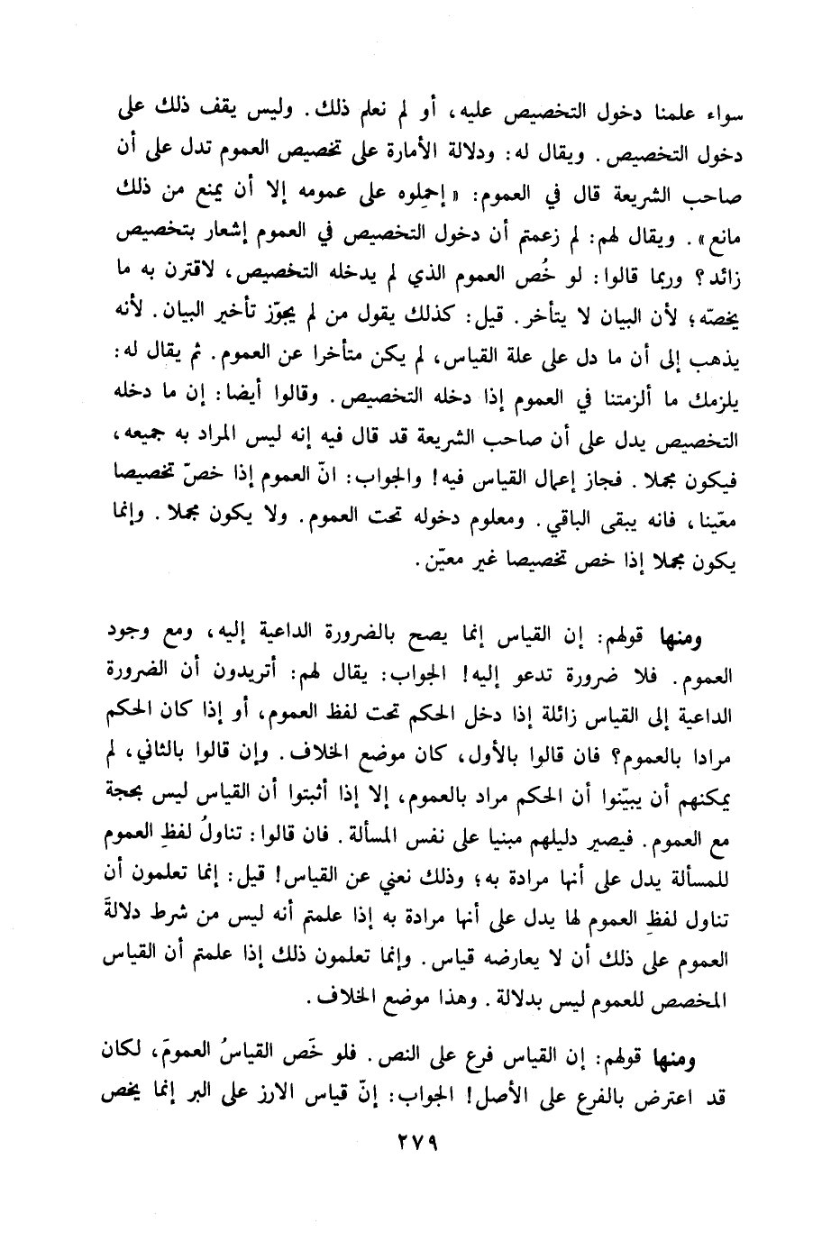 وَمِنْهَا قَوْلهم إِن الْقيَاس إِنَّمَا يَصح بِالضَّرُورَةِ الداعية إِلَيْهِ وَمَعَ وجود الْعُمُوم فَلَا ضَرُورَة تَدْعُو إِلَيْهِ الْجَواب يُقَال لَهُم اتريدون أَن الضَّرُورَة الداعية إِلَى الْقيَاس زائلة إِذا دخل الحكم تَحت لفظ الْعُمُوم أَو اذا كَانَ الحكم مرَادا بِالْعُمُومِ فان قَالُوا بِالْأولِ كَانَ مَوضِع الْخلاف وَإِن قَالُوا بِالثَّانِي لم يُمكنهُم أَن يبينوا أَن الحكم مُرَاد بِالْعُمُومِ إِلَّا إِذا اثبتوا أَن الْقيَاس لَيْسَ بِحجَّة مَعَ الْعُمُوم فَيصير دليلهم مَبْنِيا على نفس الْمَسْأَلَة فان قَالُوا تنَاول لفظ الْعُمُوم للمسألة يدل على أَنَّهَا مُرَادة بِهِ وَذَلِكَ نعني عَن الْقيَاس قيل إِنَّمَا تعلمُونَ أَن تنَاول لفظ الْعُمُوم لَهَا يدل على انها مُرَادة بِهِ إِذا علمْتُم أَنه لَيْسَ من شَرط دلَالَة الْعُمُوم على ذَلِك أَن لَا يُعَارضهُ قِيَاس وَإِنَّمَا تعلمُونَ ذَلِك إِذا علمْتُم أَن الْقيَاس الْمُخَصّص للْعُمُوم لَيْسَ بِدلَالَة وَهَذَا مَوضِع الْخلاف