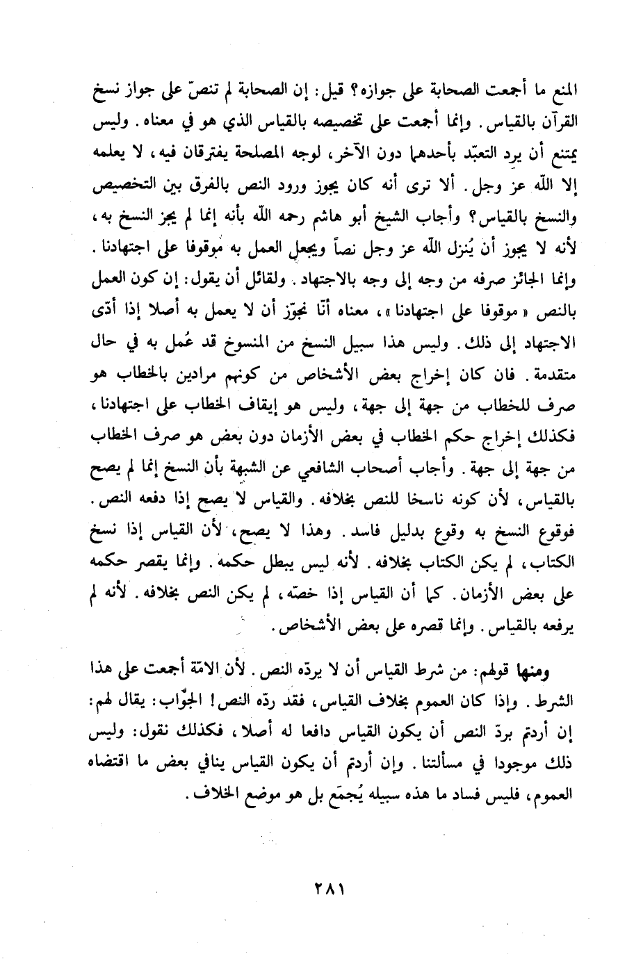 وَمِنْهَا قَوْلهم من شَرط الْقيَاس أَن لَا يردهُ النَّص لِأَن الامة أَجمعت على هَذَا الشَّرْط وَإِذا كَانَ الْعُمُوم بِخِلَاف الْقيَاس فقد رده النَّص الْجَواب يُقَال لَهُم إِن أردتم برد النَّص أَن يكون الْقيَاس دافعا لَهُ أصلا فَكَذَلِك نقُول وَلَيْسَ ذَلِك مَوْجُودا فِي مَسْأَلَتنَا وَإِن أردتم أَن يكون الْقيَاس يُنَافِي بعض مَا اقْتَضَاهُ الْعُمُوم فَلَيْسَ فَسَاد مَا هَذِه سَبيله يجمع بل هُوَ مَوضِع الْخلاف