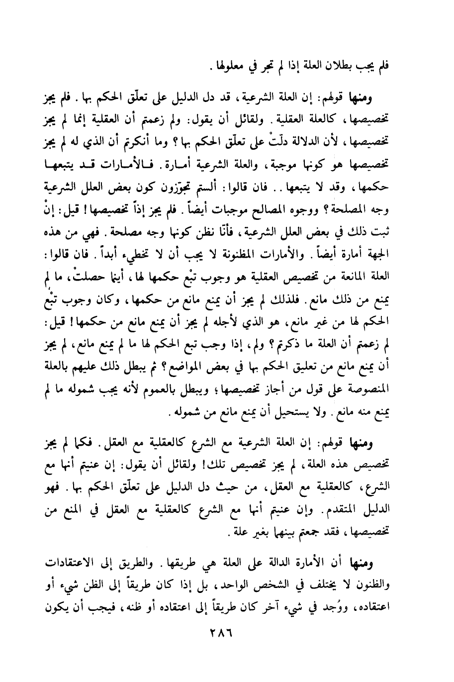 وَمِنْهَا قَوْلهم إِن الْعلَّة الشَّرْعِيَّة قد دلّ الدَّلِيل على تعلق الحكم بهَا فَلم يجز تخصيصها كالعلة الْعَقْلِيَّة وَلقَائِل أَن يَقُول وَلم زعمتم أَن الْعَقْلِيَّة إِنَّمَا لم يجز تخصيصها لِأَن الدّلَالَة دلّت على تعلق الحكم بهَا وَمَا أنكرتم أَن الَّذِي لَهُ لم يجز تخصيصها هُوَ كَونهَا مُوجبَة وَالْعلَّة الشَّرْعِيَّة أَمارَة فالأمارات قد يتبعهَا حكمهَا وَقد لَا يتبعهَا فان قَالُوا ألستم تجوزون كَون بعض الْعِلَل الشَّرْعِيَّة وَجه الْمصلحَة ووجوه الْمصَالح مُوجبَات ايضا فَلم يجز إِذا تخصيصها قيل إِن ثَبت ذَلِك فِي بعض الْعِلَل الشَّرْعِيَّة فَأَنا نظن كَونهَا وَجه مصلحَة فَهِيَ من هَذِه الْجِهَة أَمارَة أَيْضا والأمارات المظنونة لَا يجب أَن لَا تخطيء أبدا فان قَالُوا الْعلَّة الْمَانِعَة من تَخْصِيص الْعَقْلِيَّة هُوَ وجوب تبع حكمهَا لَهَا اينما حصلت مَا لم يمْنَع من ذَلِك مَانع فَلذَلِك لم يجز ان يمْنَع مَانع من حكمهَا وَكَانَ وجوب تبع الحكم لَهَا من غير مَانع هُوَ الَّذِي لأَجله لم يجز أَن يمْنَع مَانع من حكمهَا قيل لم زعمتم أَن الْعلَّة مَا ذكرْتُمْ وَلم إِذا وَجب تبع الحكم لَهَا مَا لم يمْنَع مَانع لم يجز أَن يمْنَع مَانع من تَعْلِيق الحكم بهَا فِي بعض الْمَوَاضِع ثمَّ يبطل ذَلِك عَلَيْهِم بِالْعِلَّةِ المنصوصة على قَول من أجَاز تخصيصها وَيبْطل بِالْعُمُومِ لِأَنَّهُ يجب شُمُوله مَا لم يمْنَع مِنْهُ مَانع وَلَا يَسْتَحِيل أَن يمْنَع مَانع من شُمُوله