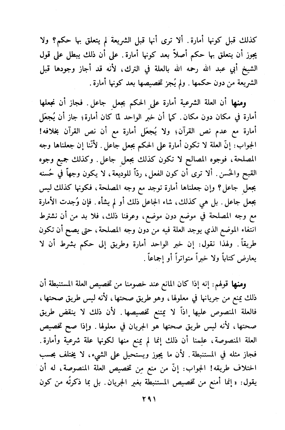 وَمِنْهَا أَن الْعلَّة الشَّرْعِيَّة أَمارَة على الحكم بِجعْل جَاعل فَجَاز أَن نَجْعَلهَا أَمارَة فِي مَكَان دون مَكَان كَمَا أَن خبر الْوَاحِد لما كَانَ أَمارَة جَازَ أَن يَجْعَل أَمارَة مَعَ عدم نَص الْقُرْآن وَلَا يَجْعَل أَمارَة مَعَ أَن نَص الْقُرْآن بِخِلَافِهِ الْجَواب إِن الْعلَّة لَا تكون أَمارَة على الحكم بِجعْل جَاعل لأننا إِن جعلناها وَجه الْمصلحَة فوجوه الْمصَالح لَا تكون كَذَلِك بِجعْل جَاعل وَكَذَلِكَ جَمِيع وُجُوه الْقبْح وَالْحسن أَلا ترى أَن كَون الْفِعْل ردا للوديعة لَا يكون وَجها فِي حسنه بِجعْل جَاعل وَإِن جعلناها أَمارَة تُوجد مَعَ وَجه الْمصلحَة فكونها كَذَلِك لَيْسَ بِجعْل جَاعل بل هِيَ كَذَلِك شَاءَ الْجَاعِل ذَلِك أَو لم يشأه فَإِن وجدت الأمارة مَعَ وَجه الْمصلحَة فِي مَوضِع دون مَوضِع وعرفنا ذَلِك فَلَا بُد من أَن نشترط انْتِفَاء الْموضع الَّذِي يُوجد الْعلَّة فِيهِ من دون وَجه الْمصلحَة حَتَّى يَصح أَن تكون طَرِيقا وَلِهَذَا نقُول إِن خبر الْوَاحِد أَمارَة وَطَرِيق إِلَى حكم بِشَرْط أَن لَا يُعَارض كتابا وَلَا خَبرا متواترا أَو إِجْمَاعًا