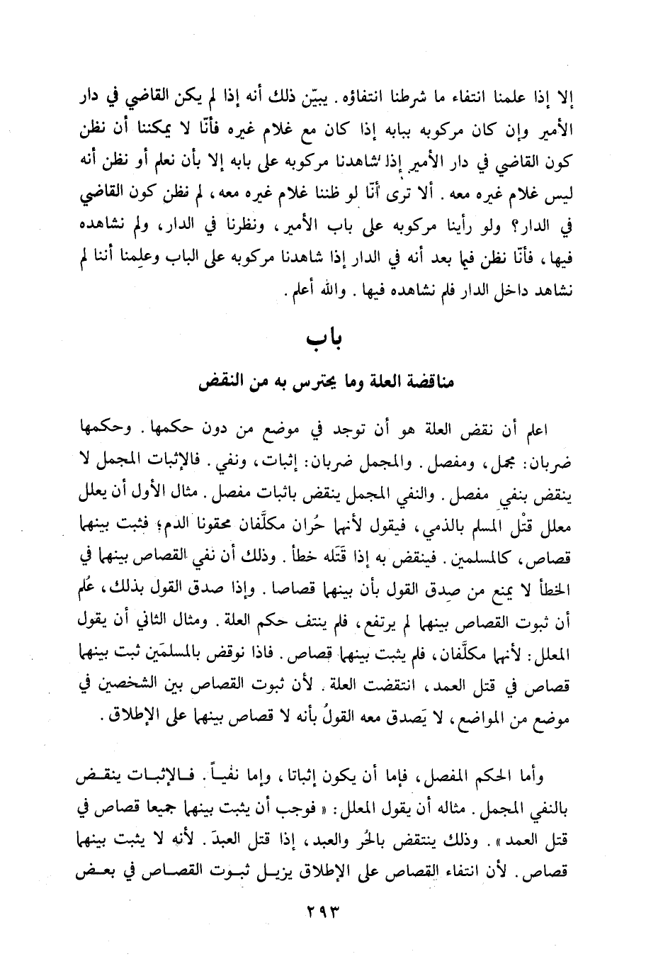 إِلَّا إِذا علمنَا انْتِفَاء مَا شرطنا انتفاؤه يبين ذَلِك أَنه إِذا لم يكن القَاضِي فِي دَار الْأَمِير وَإِن كَانَ مركوبه بِبَابِهِ إِذا كَانَ مَعَ غُلَام غَيره فانا لَا يمكننا أَن نظن كَون القَاضِي فِي دَار الْأَمِير إِذا شاهدنا مركوبه على بَابه إِلَّا بِأَن نعلم أَو نظن أَنه لَيْسَ غُلَام غَيره مَعَه أَلا ترى أَنا لَو ظننا غُلَام غَيره مَعَه لم نظن كَون القَاضِي فِي الدَّار وَلَو رَأينَا مركوبه على بَاب الْأَمِير ونظرنا فِي الدَّار وَلم نشاهده فِيهَا فانا نظن فِيمَا بعد أَنه فِي الدَّار إِذا شاهدنا مركوبه على الْبَاب وَعلمنَا أننا لم نشاهد دَاخل الدَّار فَلم نشاهده فِيهَا وَالله أعلم - صَلَّى اللَّهُ عَلَيْهِ وَسَلَّم َ - بَاب مناقضة الْعلَّة وَمَا يحترس بِهِ من النَّقْض - صَلَّى اللَّهُ عَلَيْهِ وَسَلَّم َ -