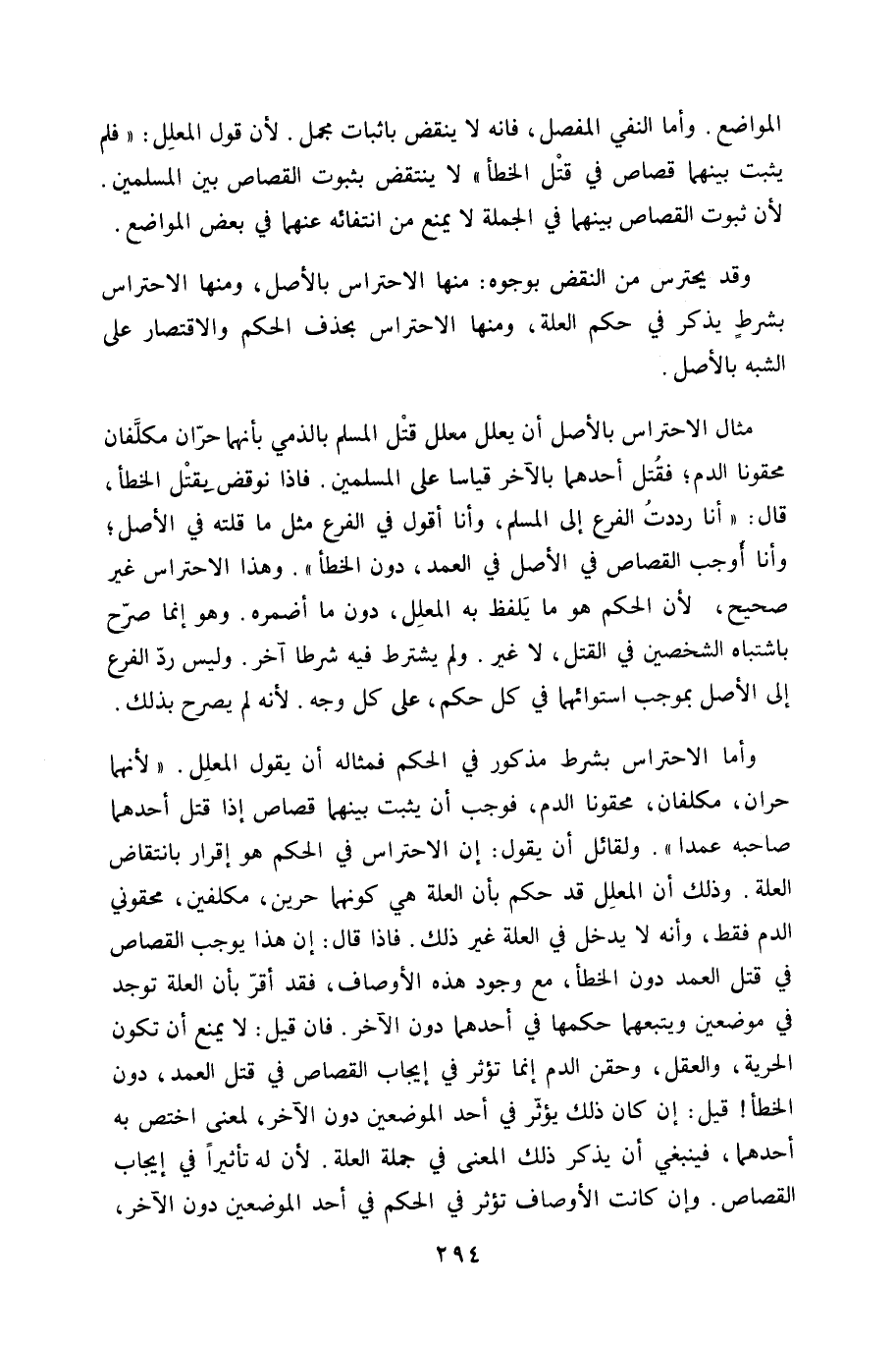 وَأما الاحتراس بِشَرْط مَذْكُور فِي الحكم فمثاله أَن يَقُول الْمُعَلل لِأَنَّهُمَا حران مكلفان محقونا الدَّم فَوَجَبَ أَن يثبت بَينهمَا قصاص إِذا قتل أَحدهمَا صَاحبه عمدا وَلقَائِل أَن يَقُول إِن الاحتراس فِي الحكم هُوَ إِقْرَار بانتقاض الْعلَّة وَذَلِكَ أَن الْمُعَلل قد حكم بِأَن الْعلَّة هِيَ كَونهمَا حُرَّيْنِ مكلفين محقوني الدَّم فَقَط وَأَنه لَا يدْخل فِي الْعلَّة غير ذَلِك فاذا قَالَ إِن هَذَا يُوجب الْقصاص فِي قتل الْعمد دون الْخَطَأ مَعَ وجود هَذِه الْأَوْصَاف فقد أقرّ بِأَن الْعلَّة تُوجد فِي موضِعين ويتبعهما حكمهَا فِي أَحدهمَا دون الآخر فان قيل لَا يمْنَع أَن تكون الْحُرِّيَّة وَالْعقل وحقن الدَّم إِنَّمَا تُؤثر فِي إِيجَاب الْقصاص فِي قتل الْعمد دون الْخَطَأ قيل إِن كَانَ ذَلِك يُؤثر فِي اُحْدُ الْمَوْضِعَيْنِ دون الآخر لِمَعْنى اخْتصَّ بِهِ أَحدهمَا فَيَنْبَغِي أَن يذكر ذَلِك الْمَعْنى فِي جملَة الْعلَّة لِأَن لَهُ تَأْثِيرا فِي إِيجَاب الْقصاص وَإِن كَانَت الْأَوْصَاف تُؤثر فِي الحكم فِي أحد الْمَوْضِعَيْنِ دون الآخر