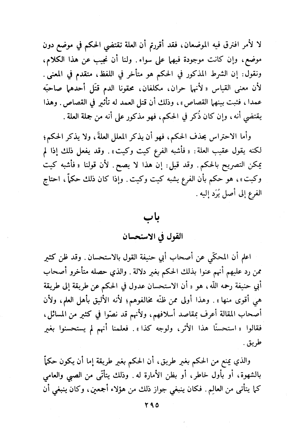 وَأما الإحتراس بِحَذْف الحكم فَهُوَ أَن يذكر الْمُعَلل الْعلَّة وَلَا يذكر الحكم لكنه يَقُول عقيب الْعلَّة فَأشبه الْفَرْع كَيْت وَكَيْت وَقد يفعل ذَلِك إِذا لم يُمكن التَّصْرِيح بالحكم وَقد قيل إِن هَذَا لَا يَصح لِأَن قَوْلنَا فَأشبه كَيْت وَكَيْت هُوَ حكم بِأَن الْفَرْع يشبه كَيْت وَكَيْت وَإِذا كَانَ ذَلِك حكما احْتَاجَ الْفَرْع إِلَى أصل يرد إِلَيْهِ - صَلَّى اللَّهُ عَلَيْهِ وَسَلَّم َ - بَاب القَوْل فِي الِاسْتِحْسَان - صَلَّى اللَّهُ عَلَيْهِ وَسَلَّم َ -