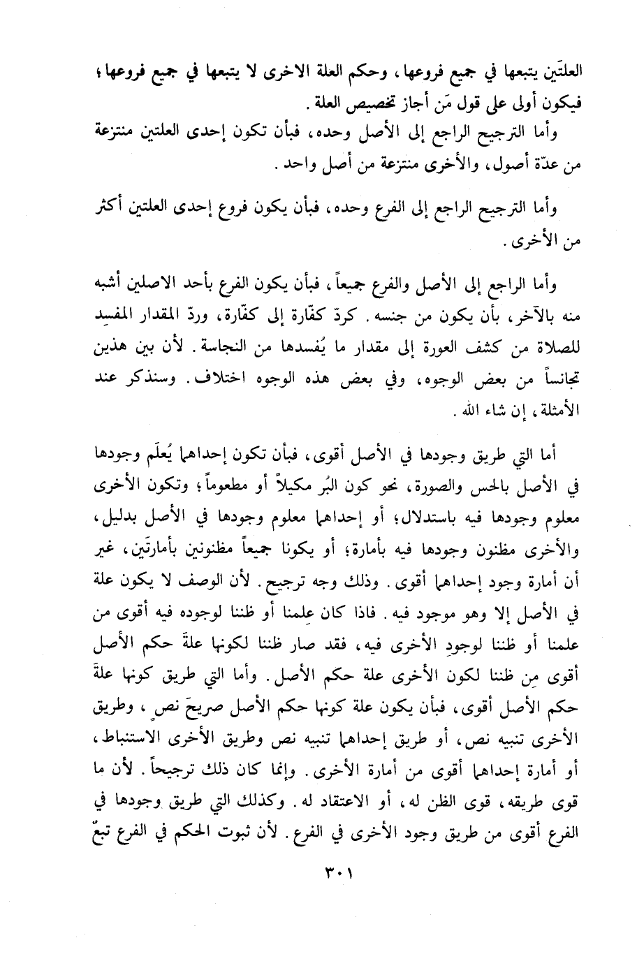 أما الَّتِي طَرِيق وجودهَا فِي الأَصْل أقوى فبأن تكون إِحْدَاهمَا يعلم وجودهَا فِي الأَصْل بالحس وَالصُّورَة نَحْو كَون الْبر مَكِيلًا أَو مطعوما وَتَكون الْأُخْرَى مَعْلُوم وجودهَا فِيهِ باستدلال أَو إِحْدَاهمَا مَعْلُوم وجودهَا فِي الأَصْل بِدَلِيل وَالْأُخْرَى مظنون وجودهَا فِيهِ بأمارة أَو يكون جَمِيعًا مظنونين بأمارتين غير أَن أَمارَة وجود إِحْدَاهمَا أقوى وَذَلِكَ وَجه تَرْجِيح لِأَن الْوَصْف لَا يكون عِلّة فِي الأَصْل إِلَّا وَهُوَ مَوْجُود فِيهِ فاذا كَانَ علمنَا أَو ظننا لوُجُوده فِيهِ أقوى من علمنَا أَو ظننا لوُجُود الآخرى فِيهِ فقد صَار ظننا لكَونهَا عِلّة حكم الأَصْل أقوى من ظننا لكَون الْأُخْرَى عِلّة حكم الأَصْل وَأما الَّتِي طَرِيق كَونهَا عِلّة حكم الأَصْل أقوى فبأن يكون عِلّة كَونهَا حكم الأَصْل صَرِيح نَص وَطَرِيق الْأُخْرَى تَنْبِيه نَص أَو طَرِيق إِحْدَاهمَا تَنْبِيه نَص وَطَرِيق الْأُخْرَى الاستنباط أَو أَمارَة إِحْدَاهمَا أقوى من أَمارَة الْأُخْرَى وَإِنَّمَا كَانَ ذَلِك تَرْجِيحا لِأَن مَا قوى طَرِيقه قوى الظَّن لَهُ أَو الِاعْتِقَاد لَهُ وَكَذَلِكَ الَّتِي طَرِيق وجودهَا فِي الْفَرْع أقوى من طَرِيق وجود الْأُخْرَى فِي الْفَرْع لِأَن ثُبُوت الحكم فِي الْفَرْع تبع