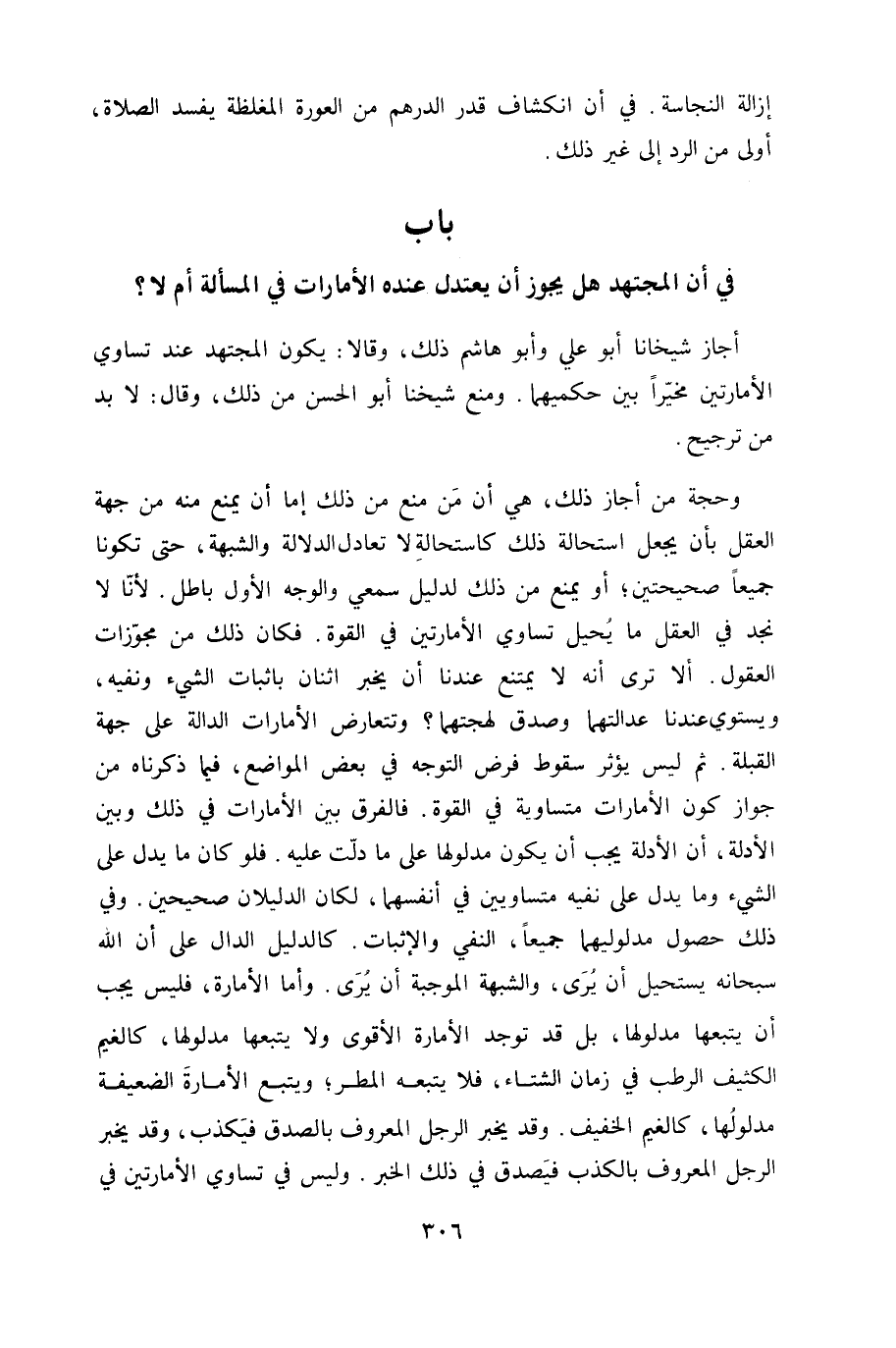 إِزَالَة النَّجَاسَة فِي أَن انكشاف قدر الدِّرْهَم من الْعَوْرَة الْمُغَلَّظَة يفْسد الصَّلَاة أولى من الرَّد إِلَى غير ذَلِك - صَلَّى اللَّهُ عَلَيْهِ وَسَلَّم َ - بَاب فِي أَن الْمُجْتَهد هَل يجوز أَن يعتدل عِنْده الأمارات فِي الْمَسْأَلَة أم لَا - صَلَّى اللَّهُ عَلَيْهِ وَسَلَّم َ -