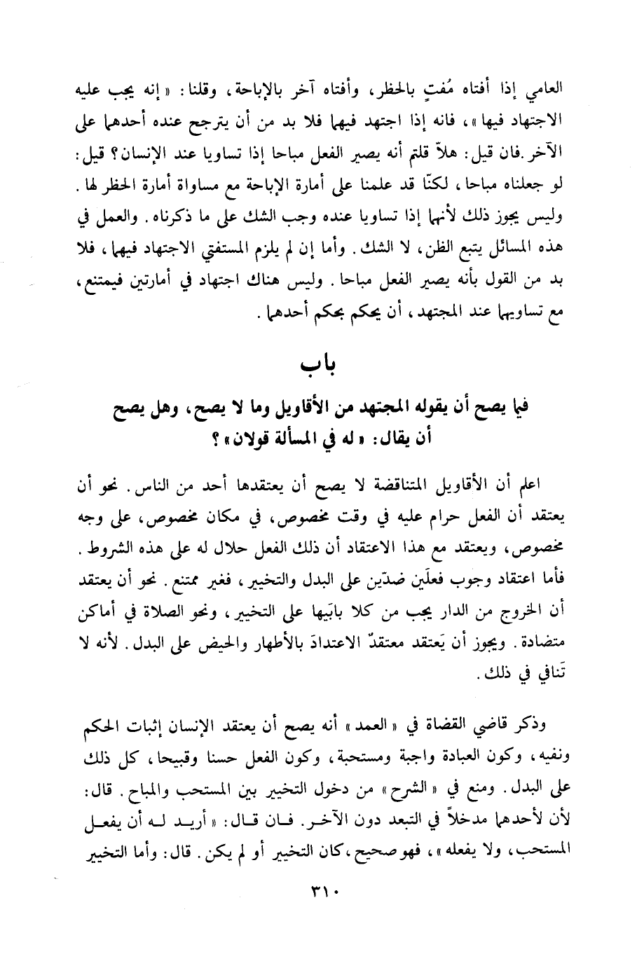 الْعَاميّ إِذا أفتاه مفت بالحظر وَأَفْتَاهُ آخر بِالْإِبَاحَةِ وَقُلْنَا إِنَّه يجب عَلَيْهِ الِاجْتِهَاد فِيهَا فانه إِذا اجْتهد فيهمَا فَلَا بُد من أَن يتَرَجَّح عِنْده أَحدهمَا على الآخر فان قيل هلا قُلْتُمْ أَنه يصير الْفِعْل مُبَاحا إِذا تَسَاويا عِنْد الْإِنْسَان قيل لَو جَعَلْنَاهُ مُبَاحا لَكنا قد علمنَا على أَمارَة الْإِبَاحَة مَعَ مُسَاوَاة أَمارَة الْحَظْر لَهَا وَلَيْسَ يجوز ذَلِك لِأَنَّهُمَا إِذا تَسَاويا عِنْده وَجب الشَّك على مَا ذَكرْنَاهُ وَالْعَمَل فِي هَذِه الْمسَائِل يتبع الظَّن لَا الشَّك وَأما إِن لم يلْزم المستفتي الِاجْتِهَاد فيهمَا فَلَا بُد من القَوْل بِأَنَّهُ يصير الْفِعْل مُبَاحا وَلَيْسَ هُنَاكَ اجْتِهَاد فِي أمارتين فَيمْتَنع مَعَ تساويهما عِنْد الْمُجْتَهد أَن يحكم بِحكم أَحدهمَا - صَلَّى اللَّهُ عَلَيْهِ وَسَلَّم َ - بَاب فِيمَا يَصح أَن يَقُوله الْمُجْتَهد من الْأَقَاوِيل وَمَا لَا يَصح وَهل يَصح أَن يُقَال لَهُ فِي الْمَسْأَلَة قَولَانِ - صَلَّى اللَّهُ عَلَيْهِ وَسَلَّم َ -